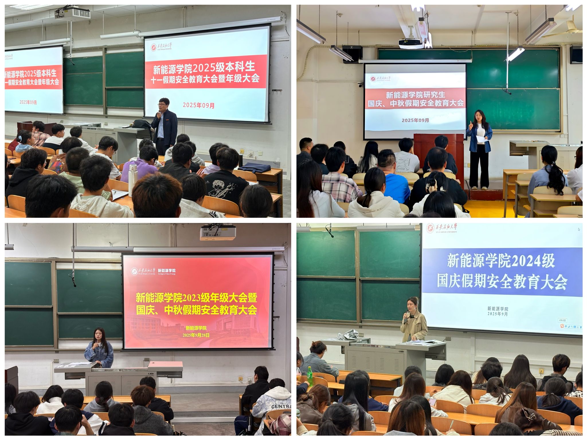 為切實加強學院學生安全教育管理,確保國慶、中秋雙節期間安全穩定,9月27日至29日,新能源學院組織各本科生、研究生年級分批次召開假期安全教育暨年級大會。學院全體學生在輔導員的組織下全員參與,通過系統化、全覆蓋的安全教育舉措,筑牢安全管理防線。