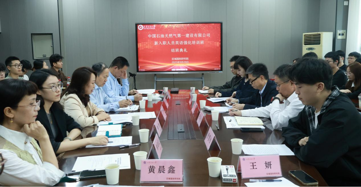 9月29日下午,區域國別研究院在雁塔校區東方石油樓4-04會議室舉辦了中國石油天然氣第一建設有限公司新入職人員國際化能力培訓班結業典禮。中國石油天然氣第一建設有限公司總經理助理劉明國、總經理助理兼國際事業部經理張俊生、國際事業部培訓主管池凝、區域國別研究院執行院長劉輝、培訓班部分任課教師和全體學員參加了結業典禮,結業典禮由區域國別研究院辦公室副主任陶李主持。