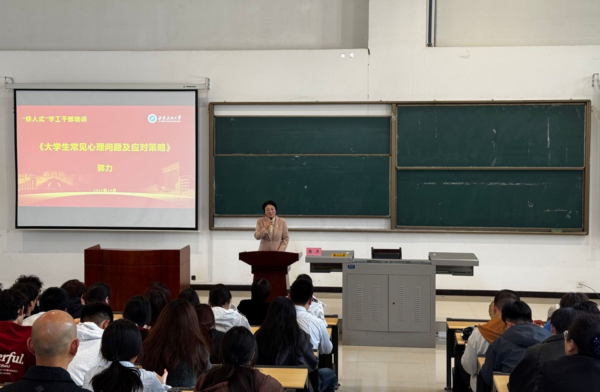 為進一步提升學工干部心理健康服務專業知識,筑牢我校“校級--院系--班級--生活園區--師生個體”五級心理危機防控暨心理健康教育網絡體系,10月15日學生工作部邀請我校特聘心理咨詢顧問、空軍軍醫大學第一附屬醫院心身科副主任醫師郭力在鄠邑校區石工地科樓115開展“鐵人式”學工干部心理健康專題培訓講座。各院系學工干部、心理成長指導中心老師、院系班級心理委員代表、大學生心理協會學生代表、學生代表,及保衛干部、樓管等后勤人員代表共200余人參加。培訓由學生工作部副部長畢軼慧主持。
