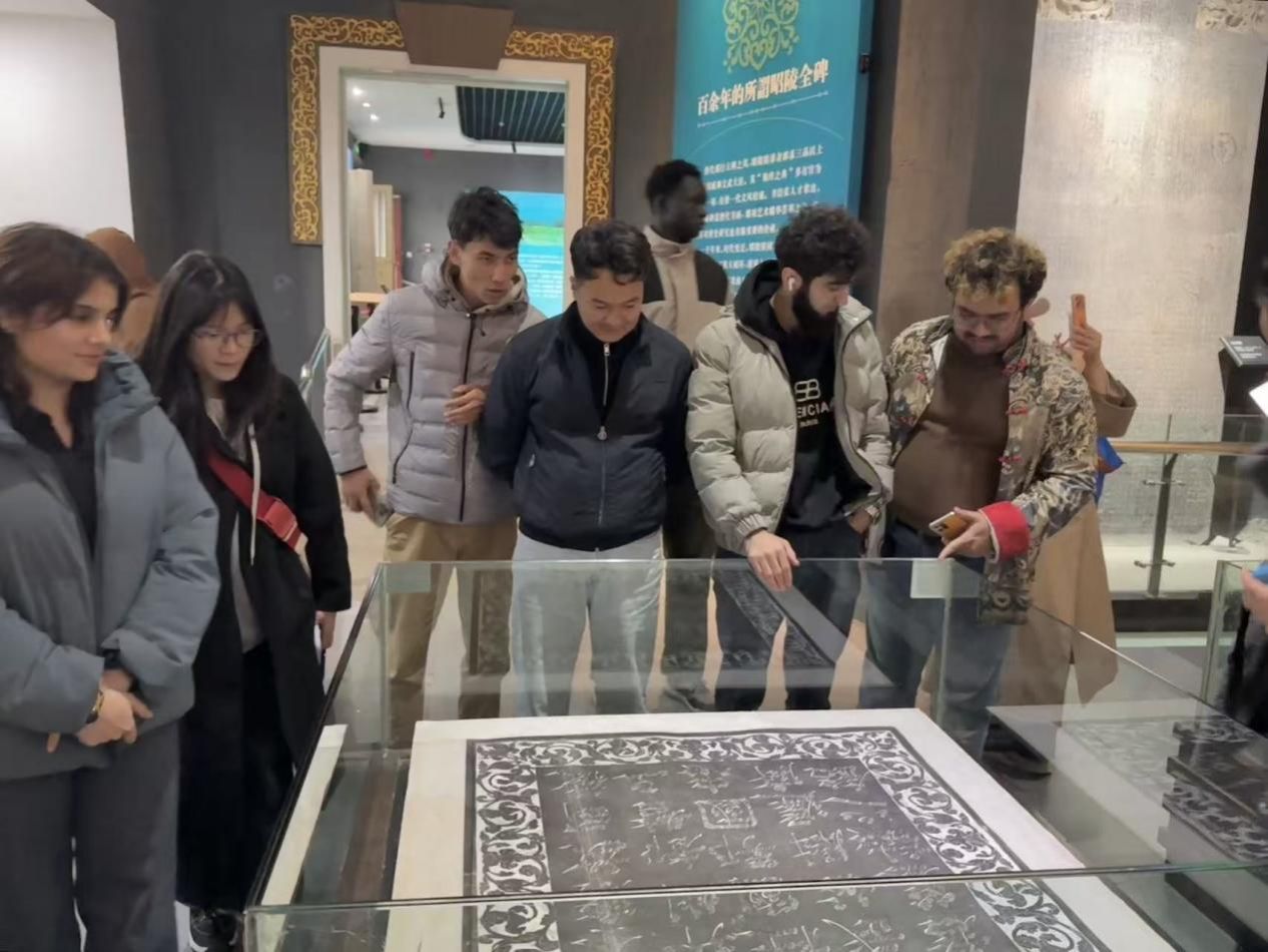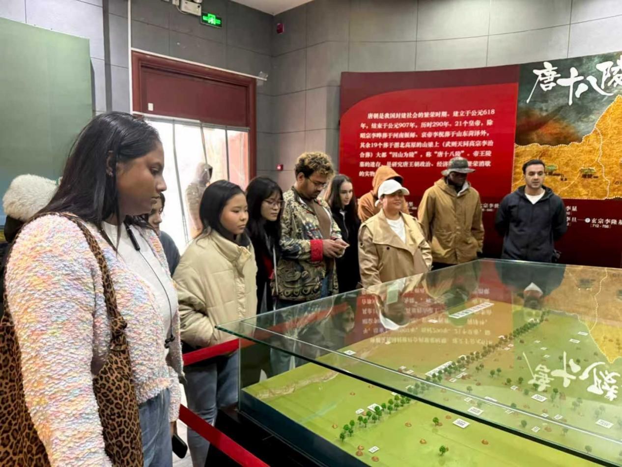 當日下午,實踐團隊前往陜西省咸陽市禮泉縣昭陵博物館,開啟文化研學之旅。國際學生在工作人員引導下,先后參觀昭陵文物精華展、昭陵碑林,欣賞昭陵唐墓壁畫。通過聆聽專業講解與近距離觀賞文物,學生們將抽象的“盛唐”概念具象化,深刻感受唐代與各國、各民族友好交往、交流、交融的歷史場景,直觀體會中華文化的厚重底蘊。