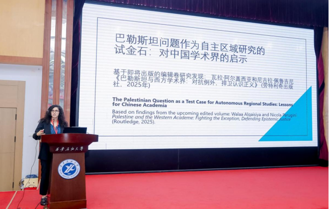 西北大學中東研究所Walaa Alqaisiya博士作題為《The Palestinian Exception in Western Academia:Implications for Chinese Region and Country Studies 》的主旨報告,通過揭示知識生產體系如何被帝國主義利益結構性侵蝕的重要標尺,剖析了西方學術界在巴勒斯坦問題研究中的系統性缺陷,探討這些經驗對構建中國區域與國家研究自主框架的啟示。