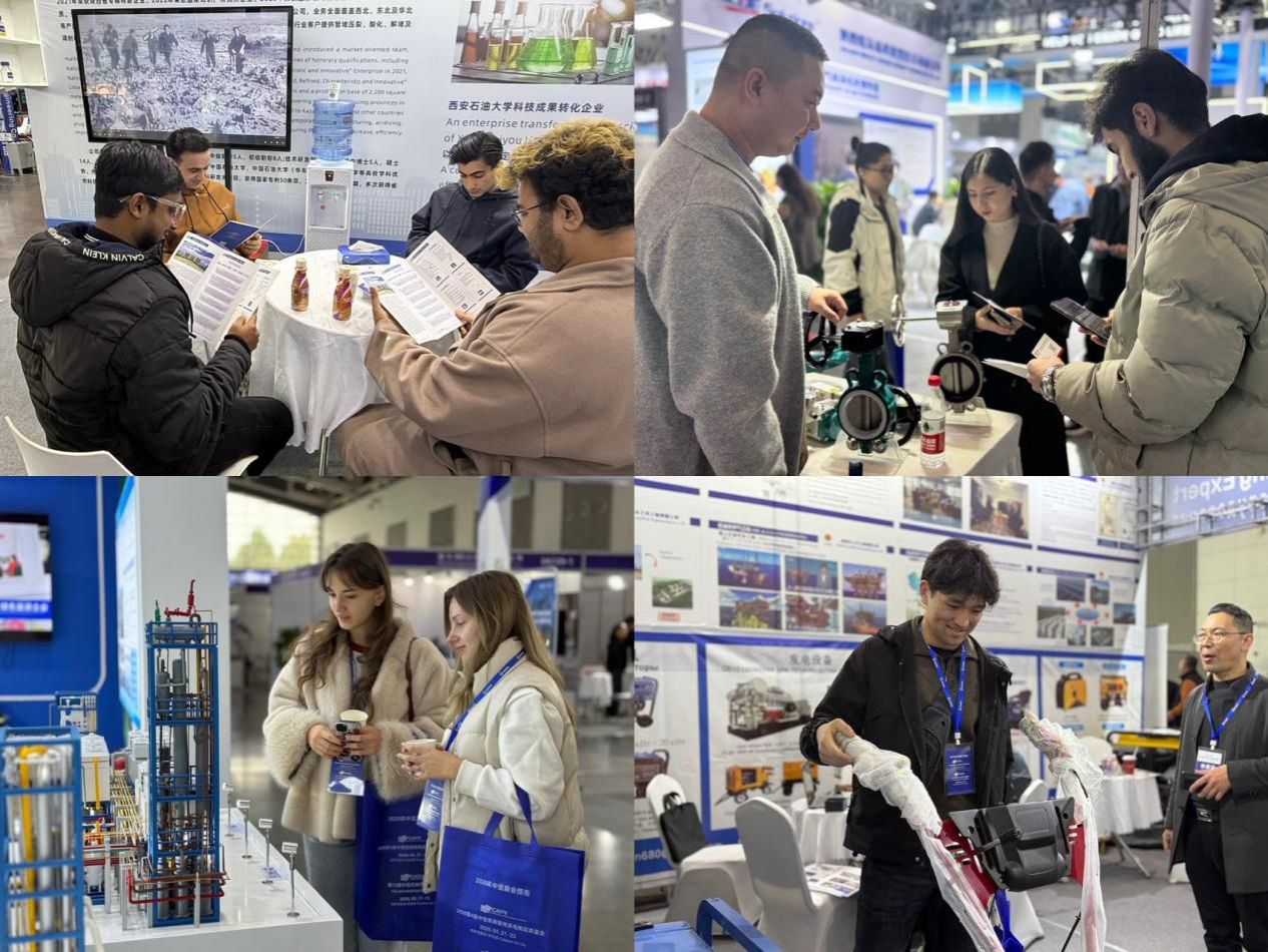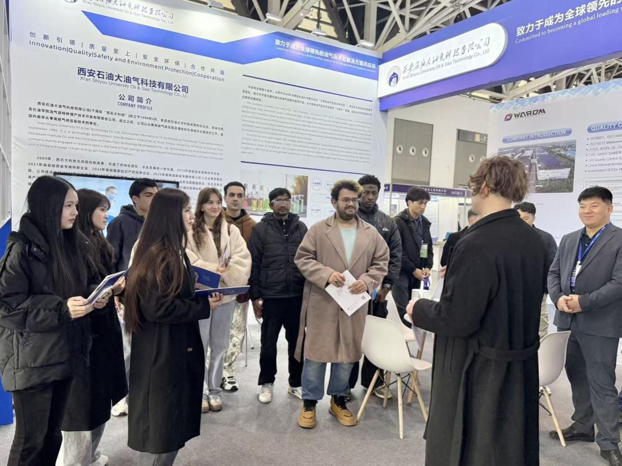 我校學生在西安石油大油氣科技有限公司外事項目經理丹尼斯(研2022級國際校友)帶領下,詳細了解了該公司發展歷程、運營模式、技術應用場景及科技成果轉化過程。展會期間,學生們依次走訪各企業展位,系統了解了石油鉆采設備、油氣儲運設備、油氣煉化及精細化工裝備、泵閥、電機、儀器儀表等上中下游全產業鏈條物資裝備。參觀過程中,學生們結合專業知識主動提問,與企業科研人員深入探討技術細節,參展代表逐一耐心解答、細致引導講解,現場互動氛圍熱烈。