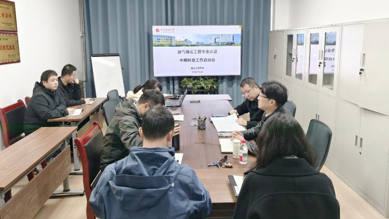 為扎實推進專業內涵建設,全面提升本科教育教學質量,確保油氣儲運工程專業認證工作有序推進,2025 年 10 月 28 日上午,管道工程學院在雁塔校區東方石油樓 1105 室召開油氣儲運專業認證中期檢查工作啟動會。學院院長蔣華義、油氣儲運工程系主任潘杰、副主任徐士祺、黨支部書記王勇、骨干教師及教學辦主任李晶參加會議,會議由副院長崔瑩主持。