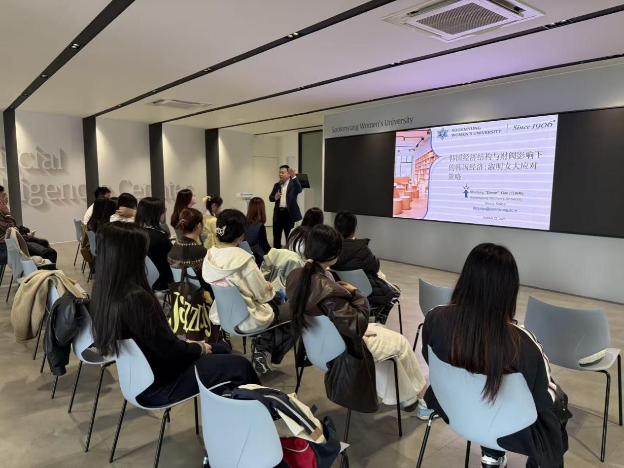 在淑明女子大學的學術交流環節,研習團師生深入參與了多場高水平專題講座。肖樹峰教授主講的《韓國經濟結構與財閥影響下的韓國經濟:淑明女子應對策略》,從全球經濟格局的宏觀視角切入,詳細解析了韓國經濟的發展歷程、產業結構特征及其在全球價值鏈中的定位。講座聚焦三星、現代、SK等財閥集團對韓國經濟生態的深遠影響,引發了師生對新興經濟體發展模式的深入思考。