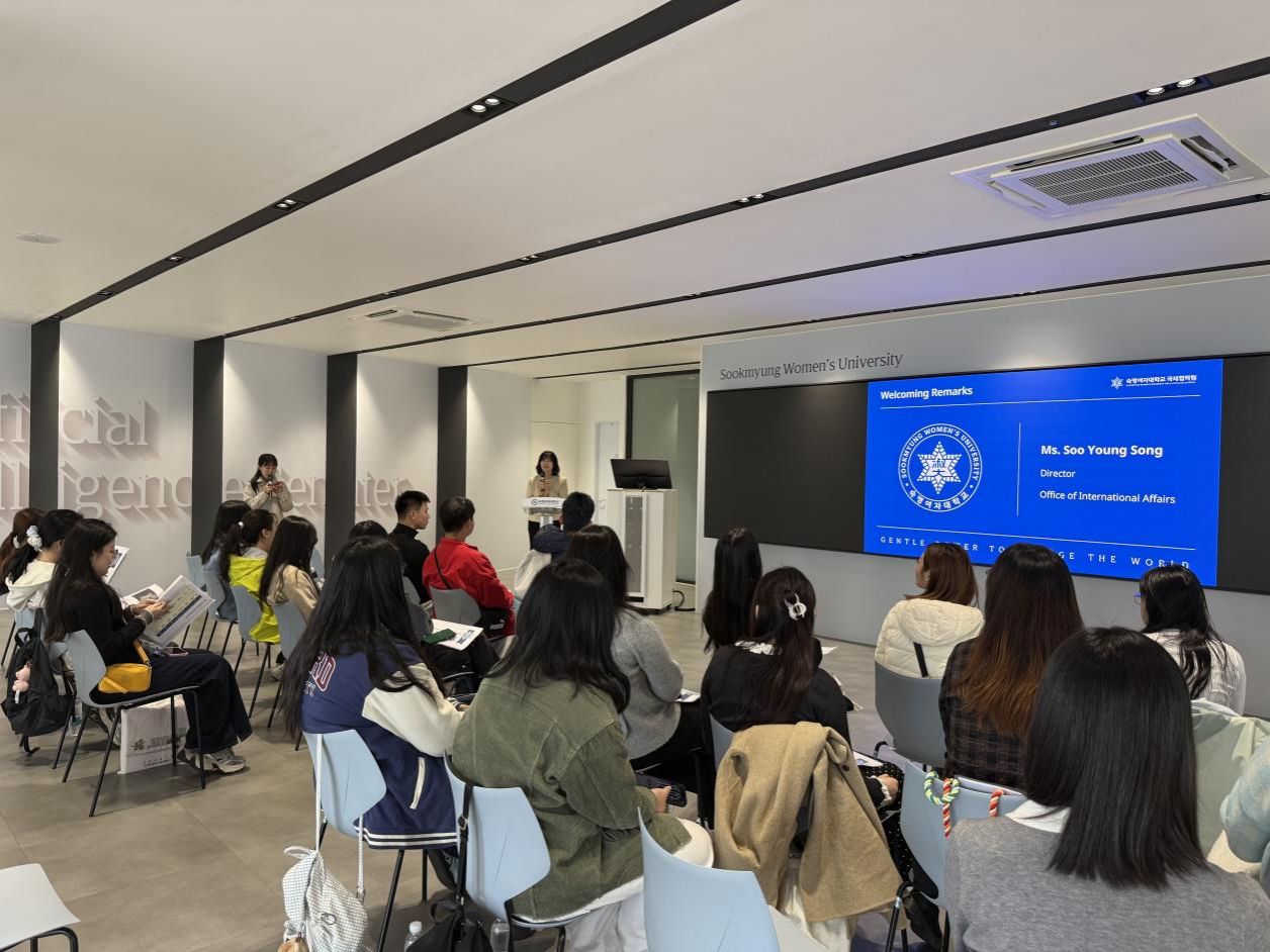項目伊始,淑明女子大學為研習團舉行了溫馨的歡迎儀式。淑明女子大學國際處國際協力組&留學生服務組組長宋秀英對師生們的到來表示熱烈歡迎,并詳細介紹了未來幾天的學習安排與體驗計劃。她鼓勵同學們在課程學習中多感受、多體會,真正融入校園氛圍,深入理解韓國文化,收獲充實而難忘的交流經驗。