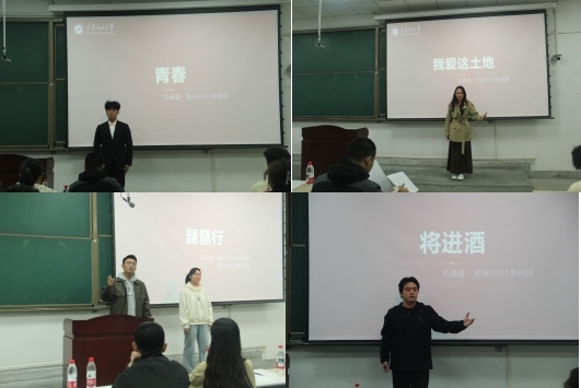 比賽在熱烈氛圍中拉開帷幕。圍繞“典耀中華,賡續文脈”主題,參賽選手依次登臺,以飽滿的熱情和多樣的形式演繹經典作品。有的深情婉轉,如溪流潺潺;有的激昂澎湃,似烈火熾燃。《將進酒》的豪邁、《青春》的激揚、《琵琶行》的婉轉、《中國文脈》的厚重……選手們用聲音勾勒詩意畫卷,用情感傳遞文化力量,贏得了現場觀眾的陣陣掌聲。經過激烈角逐,勘探2503鄧雯軒《青春》 與勘探2501李興喆《將進酒》 斬獲一等獎,并將代表學院參加校級“秋之韻”詩文配樂朗誦比賽。