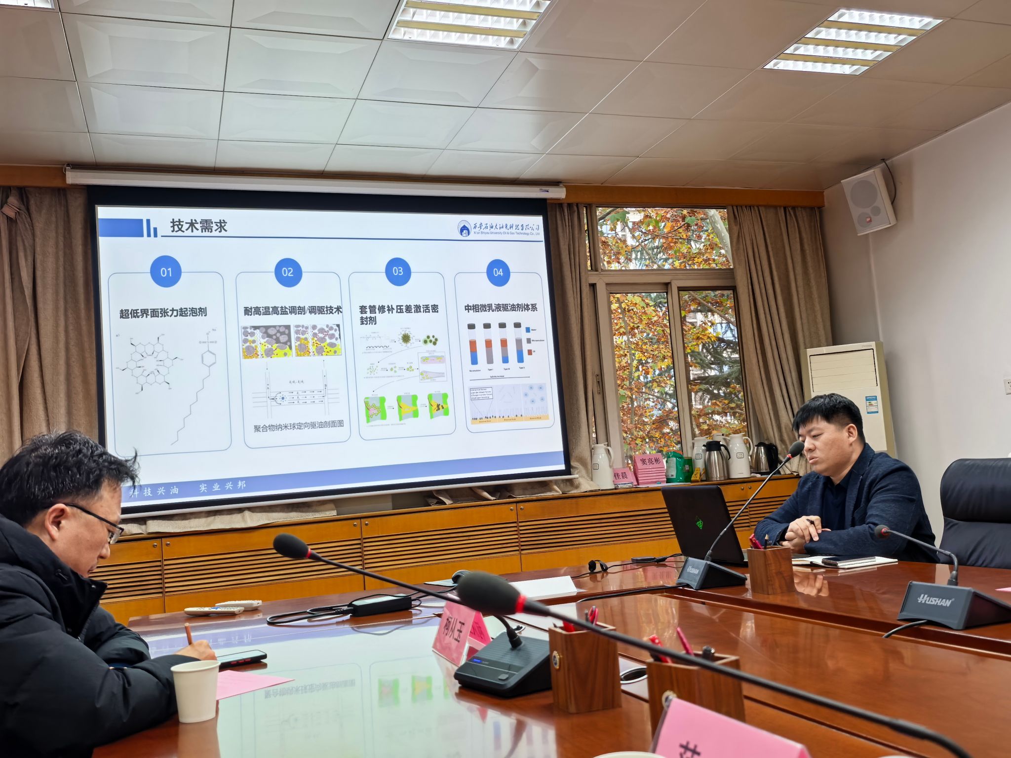 會上,李婷介紹了公司的基本情況,黃兆豐發布了公司的技術需求。柯從玉、陳世軍分別以“中相微乳液驅油劑篩選優化及性能評價”“高溫高鹽油藏調剖堵水技術”“長慶油田低滲/超低滲油藏超低界面張力起泡劑”為題對公司的技術需求進行了揭榜匯報。隨后校企雙方就技術需求和研發方案細節進行了深入溝通交流。