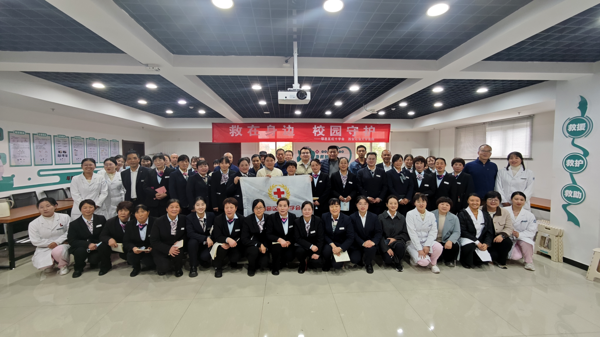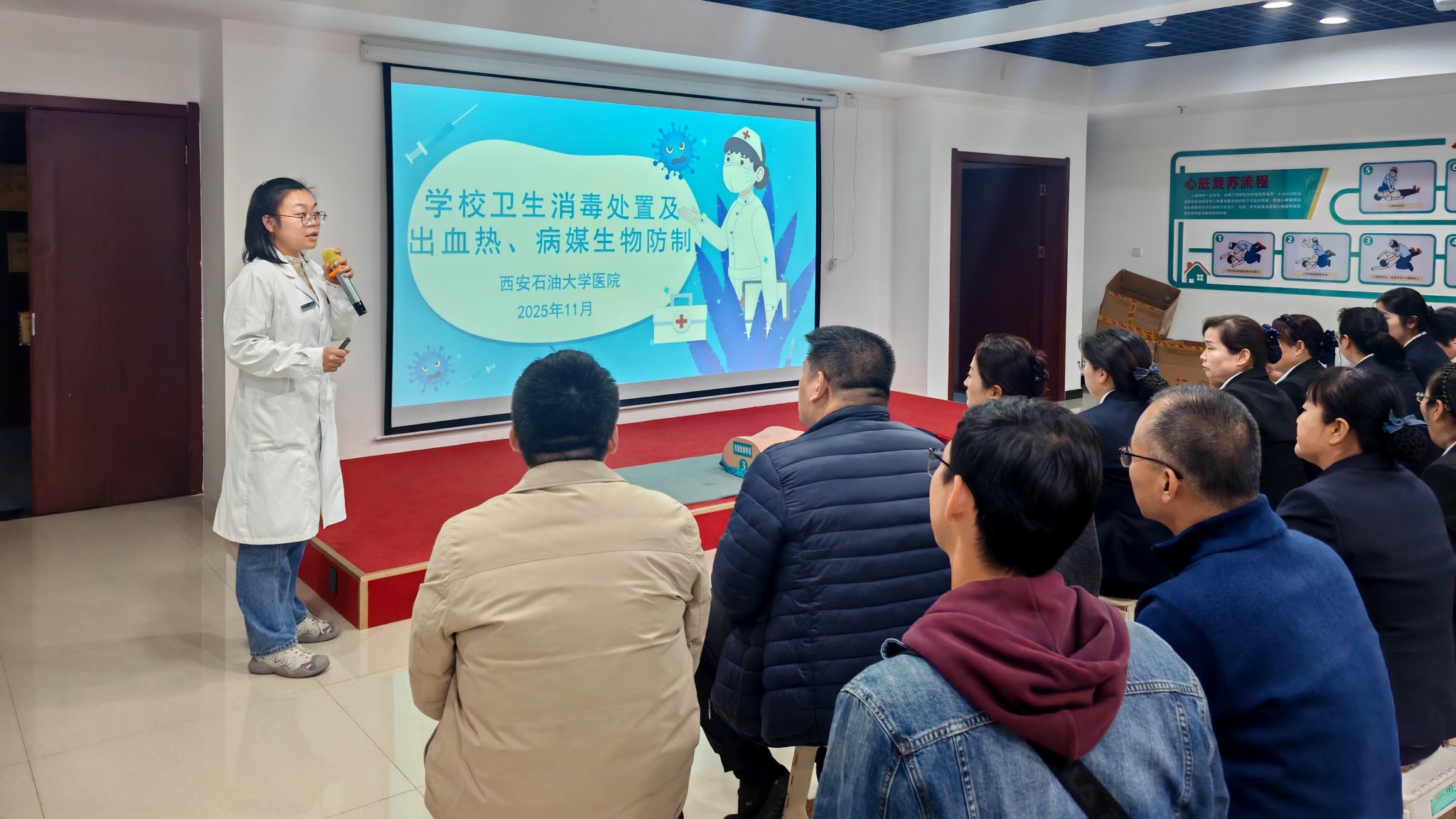 為全面提升校園應急保障能力,筑牢師生生命安全防線,夯實幸福西石大建設的安全根基,推動第三批“急救校園”建設落地見效,2025年11月5日下午,西安市鄠邑區紅十字會、校工會與校醫院聯合開展第二期教職工應急救護專項培訓,40余名教職工(以后勤工作人員為主)踴躍參與,以專業賦能注入安全動能。同步開展學校衛生消毒處置及出血熱、病媒生物防治科普講座,以專業賦能全方位筑牢校園安全防線。