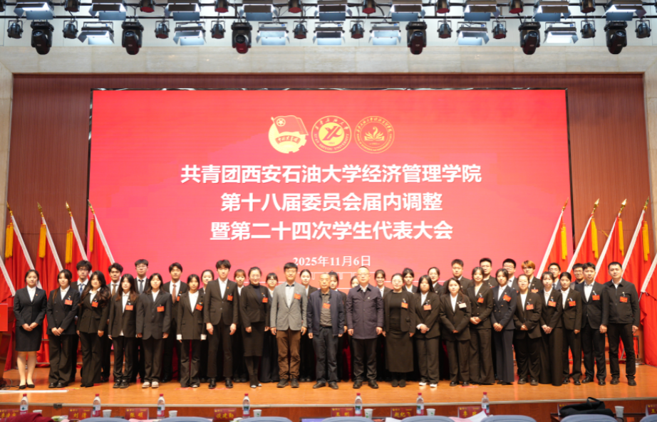 2025年11月6日,共青團西安石油大學經濟管理學院第十八屆委員會屆內調整暨第二十四次學生代表大會在鄠邑校區弘石學術報告廳順利召開。學院黨委書記談建勤、校團委書記王剛、經濟管理學院黨委副書記趙紀飛、經濟管理學院團委書記張碩、學院各年級團總支書記、輔導員以及各兄弟院系學生會主席團代表、學院學生代表200余人參加了此次會議。