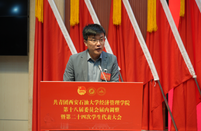 校團委書記王剛致詞,他代表校團委、校學生會和研究生會向本次大會的勝利召開表示祝賀,肯定了經濟管理學院團委堅持以習近平新時代中國特色社會主義思想為指引,堅持“黨建帶團建”工作總基調,緊緊圍繞學校中心工作,持續深化“三力一度兩保障”工作格局,廣泛引領凝聚青年,有力組織動員青年,切實聯系服務青年,全面深化改革,全面從嚴治團,圍繞強化思想政治引領、服務成長成才、夯實基層基礎、防范化解風險等方面取得了良好成績。并提出三點希望,一是加強對團員青年的思想政治引領工作;二是組織動員團員青年奮勇爭先挺膺擔當;三是努力做好黨的忠實助手和可靠后備軍。