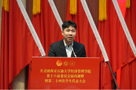 石油工程學院學生會主席梁國璽代表各院系學生會發言,對經濟管理學院團學工作的豐碩成績表示祝賀,表示將保持密切聯系,為西石大的美好未來不懈奮斗。