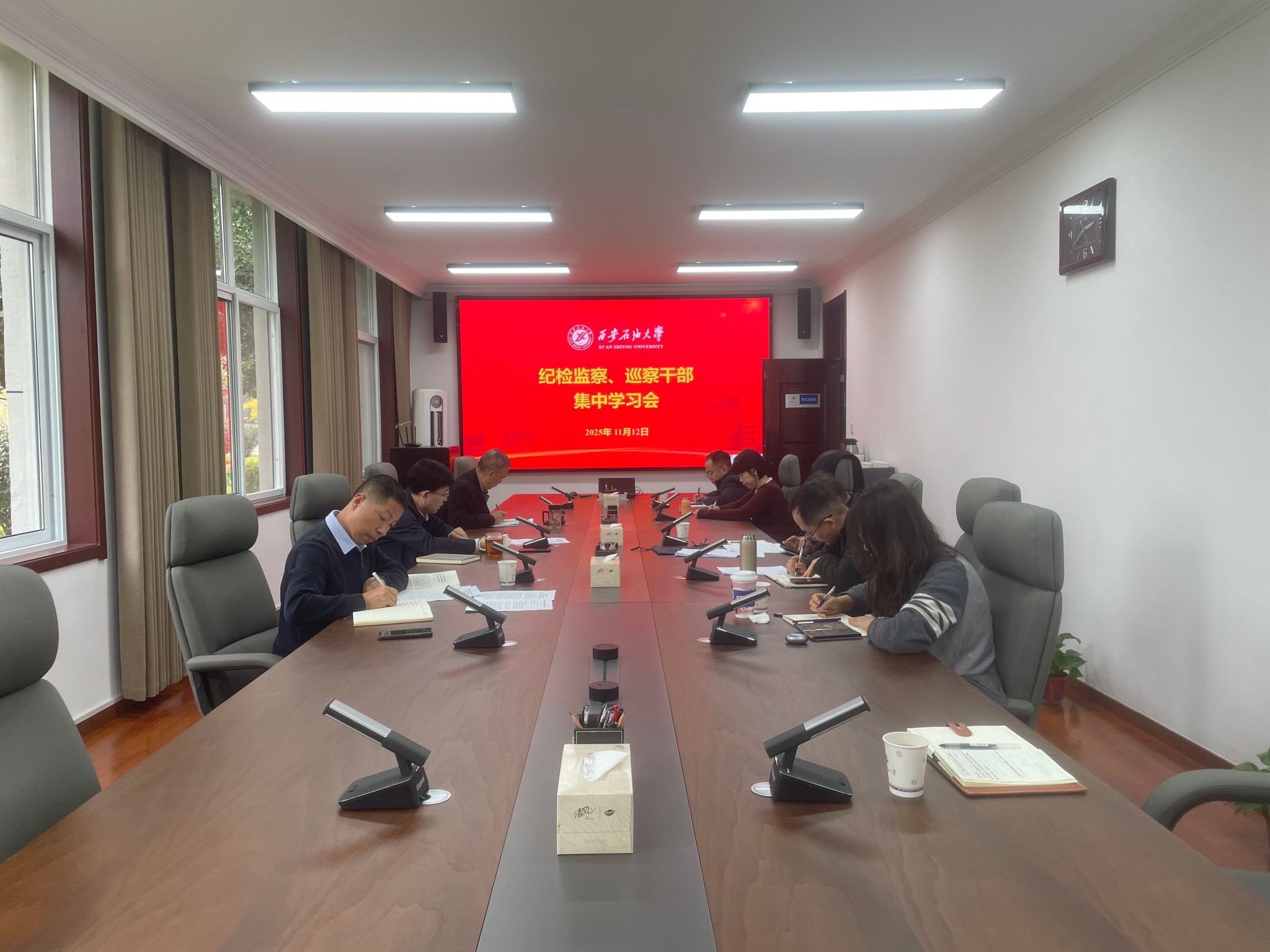 11月12日上午,紀檢巡察干部2025年第21次集中學習會在鄠邑校區辦公樓第五會議室召開。校黨委副書記、紀委書記、監察專員王輝強主持學習會。紀檢監察機構、黨委巡察工作辦公室全體干部參加會議。