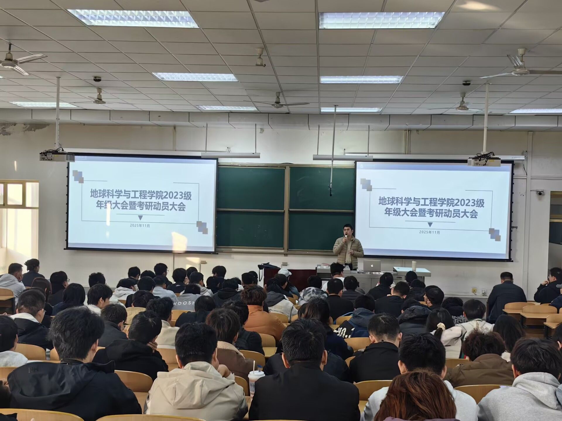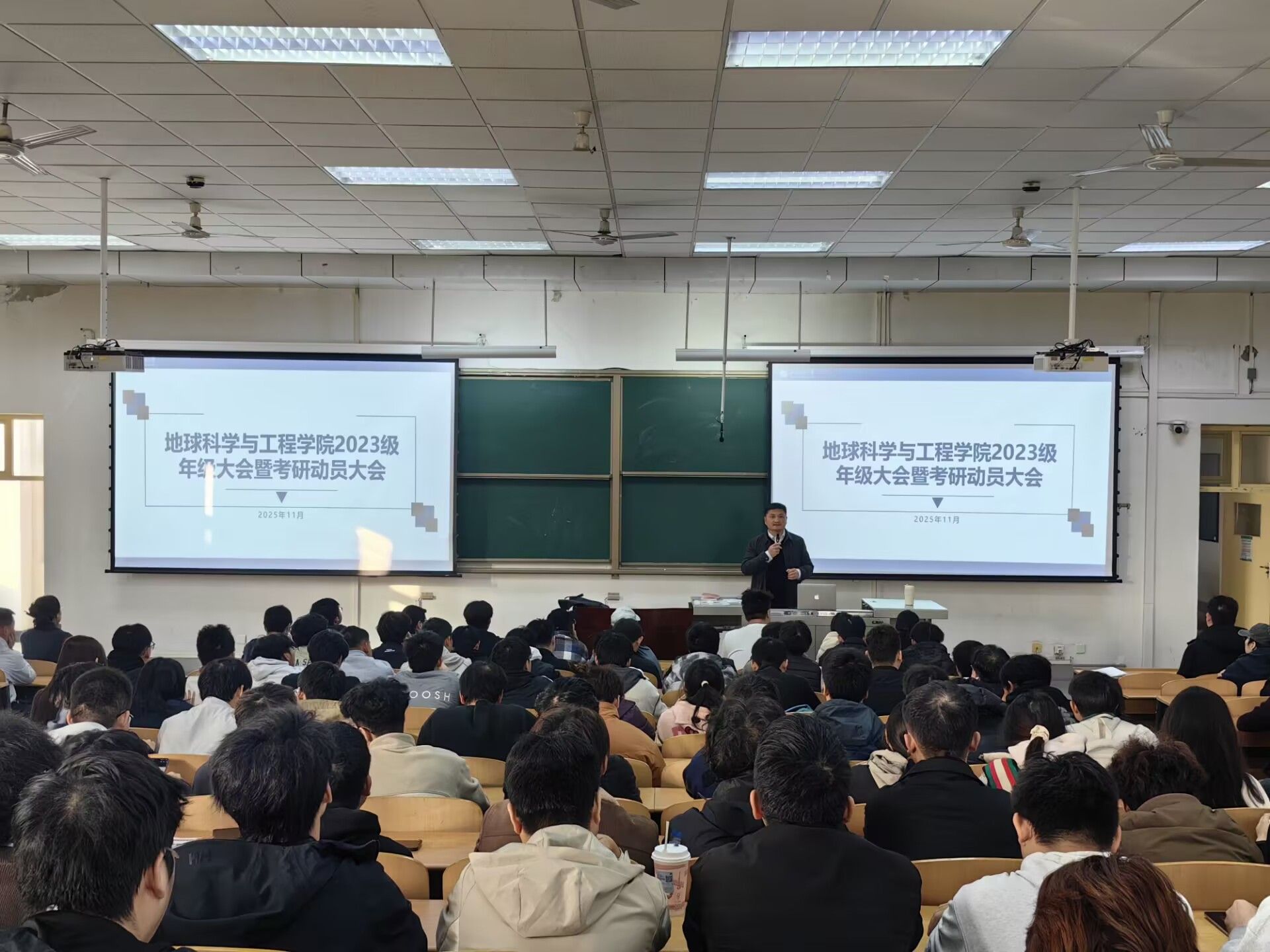 為進一步加強學生安全教育,強化學風建設,引導學生明確學業目標,地球科學與工程學院于11月13日在鄠邑校區博覽樓239教室舉行2023級年級大會暨考研動員大會。學院黨委副書記董丙劍出席大會,2023級全體學生參加。大會由2023級輔導員劉學斌主持。