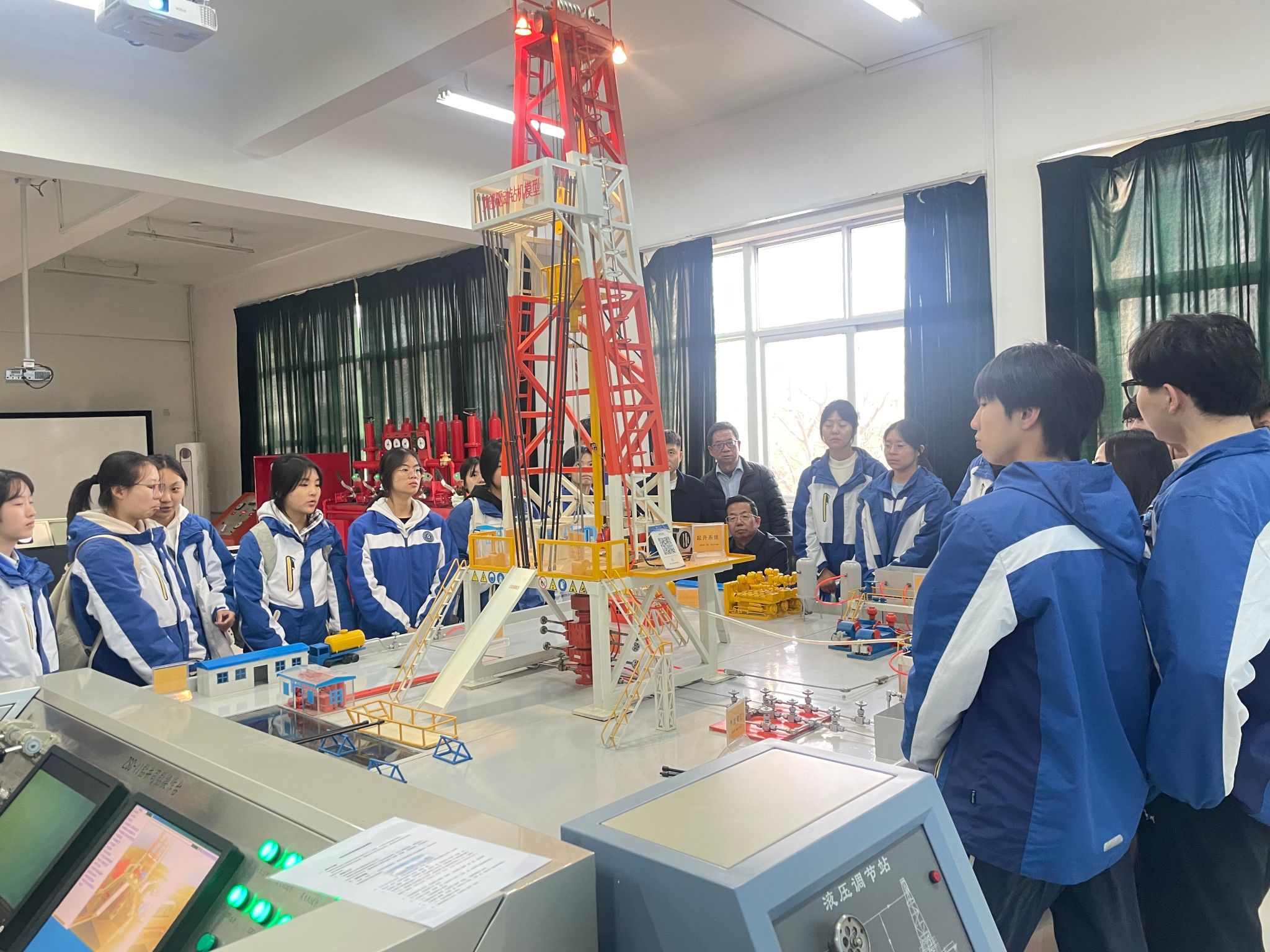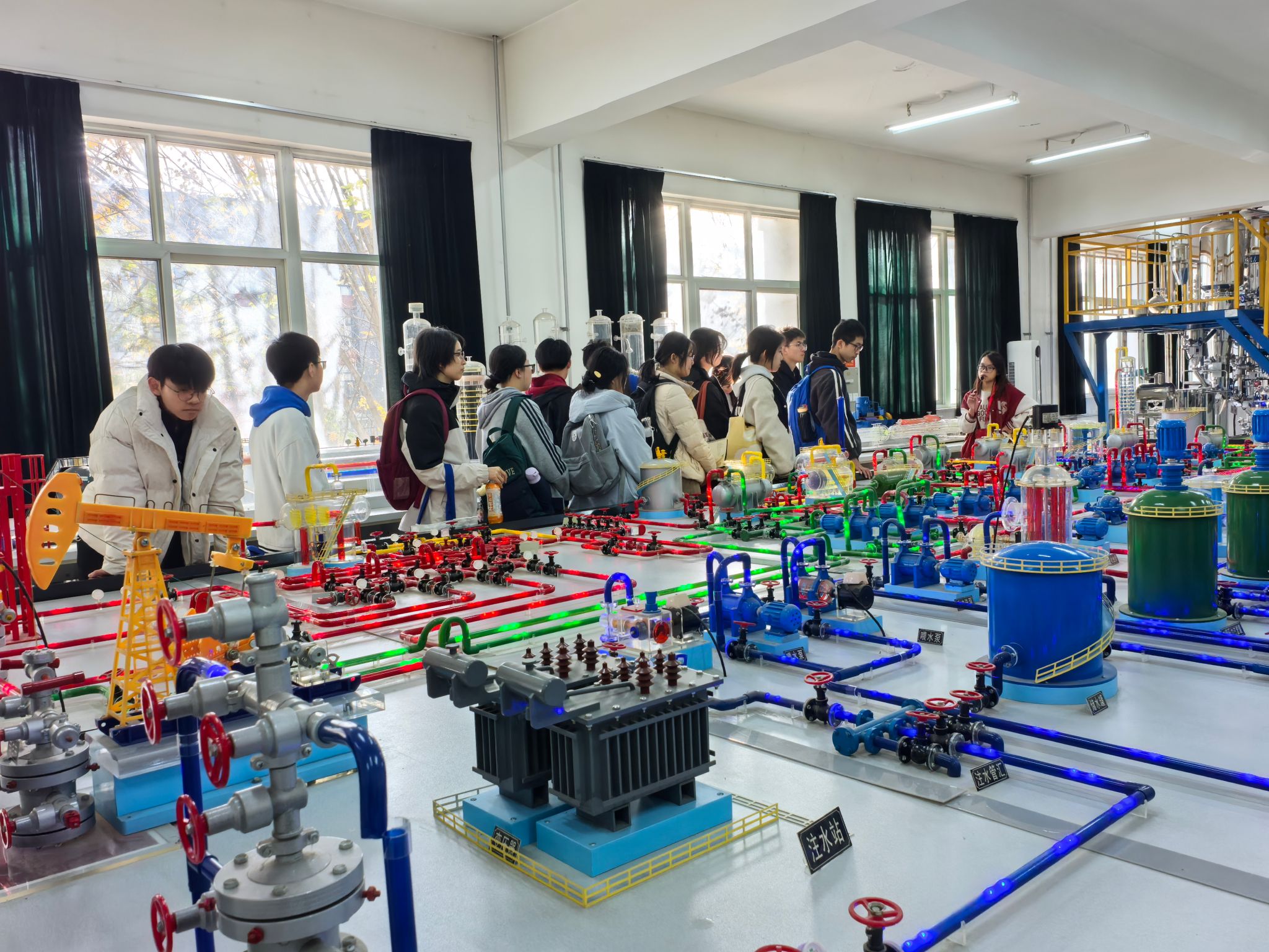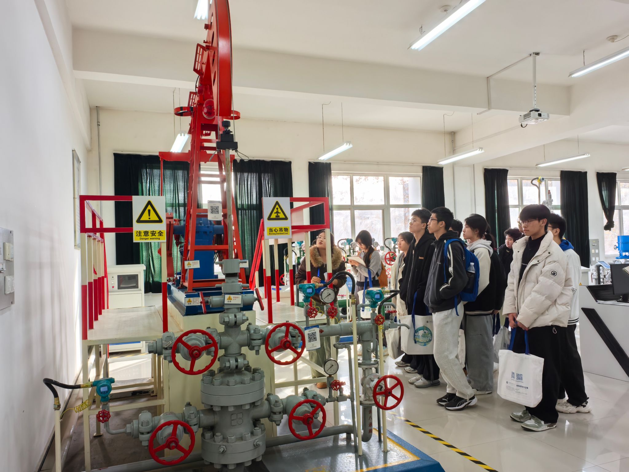 研學活動最后一站參觀了我校陜西省石油石化虛擬仿真實驗教學中心。在大學生講解員的帶領下,五高師生參觀了鉆井實訓室、地質標本實訓室、采油實訓室、油氣分布沙盤、集輸、煉化實訓室、采油實訓室。通過參觀學習,學生初步了解了石油勘探、開采、煉化和運輸的全過程,近距離感受到了石油石化及地質行業的魅力與挑戰。