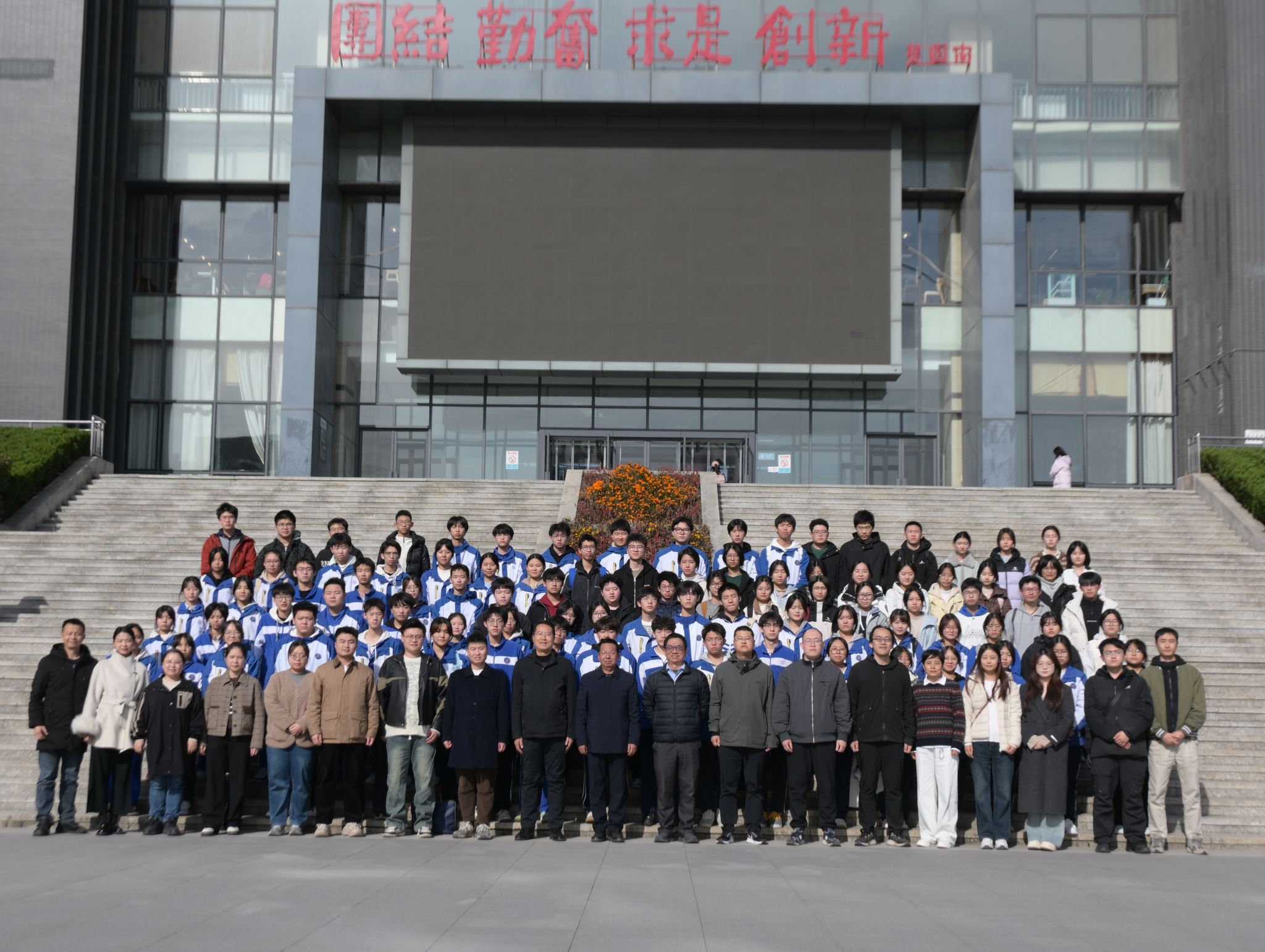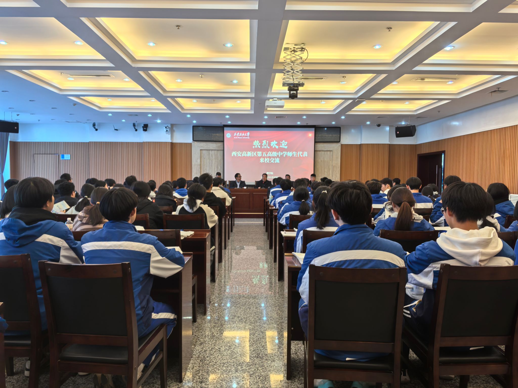 2025年11月19日下午,西安高新區第五高級中學(以下簡稱五高)受邀來我校開展研學活動,校長劉占權帶領師生代表100余人參加活動。理學院招生宣傳工作組代表學校接待五高師生并在鄠邑校區第一會議室舉行簡短的歡迎儀式。理學院黨委書記席利哲、副院長馬儇龍、理學院教授兼五高科技副校長郭文閣及理學院教師代表參加歡迎儀式。歡迎儀式開始前,與會人員在圖書館南門臺階前合影留念。歡迎儀式上,席利哲代表學校及理學院對五高師生代表的到來表示熱烈歡迎,并簡要介紹了研學活動行程和學校概況。