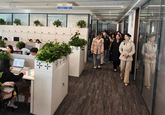 在工作人員引導下,師生一行參觀了事務所的審計一部、工程造價部、技術支持部及員工共享空間等。通過實地走訪,同學們對事務所的組織架構與業務流程有了更為直觀的認識,切身感受到立信嚴謹專業的工作氛圍和以人為本的員工關懷,深刻體會到其團隊協作精神與客戶服務理念。
