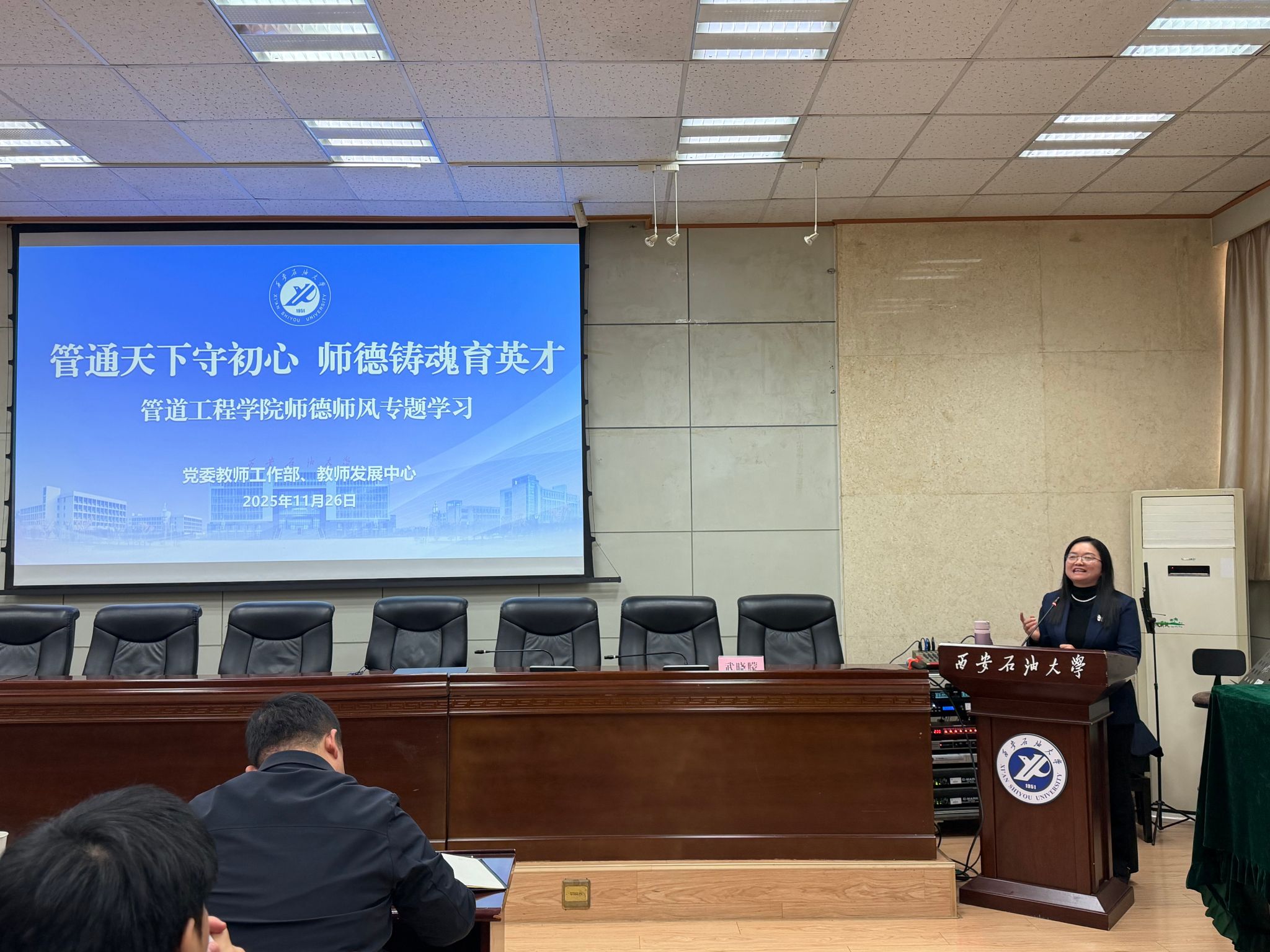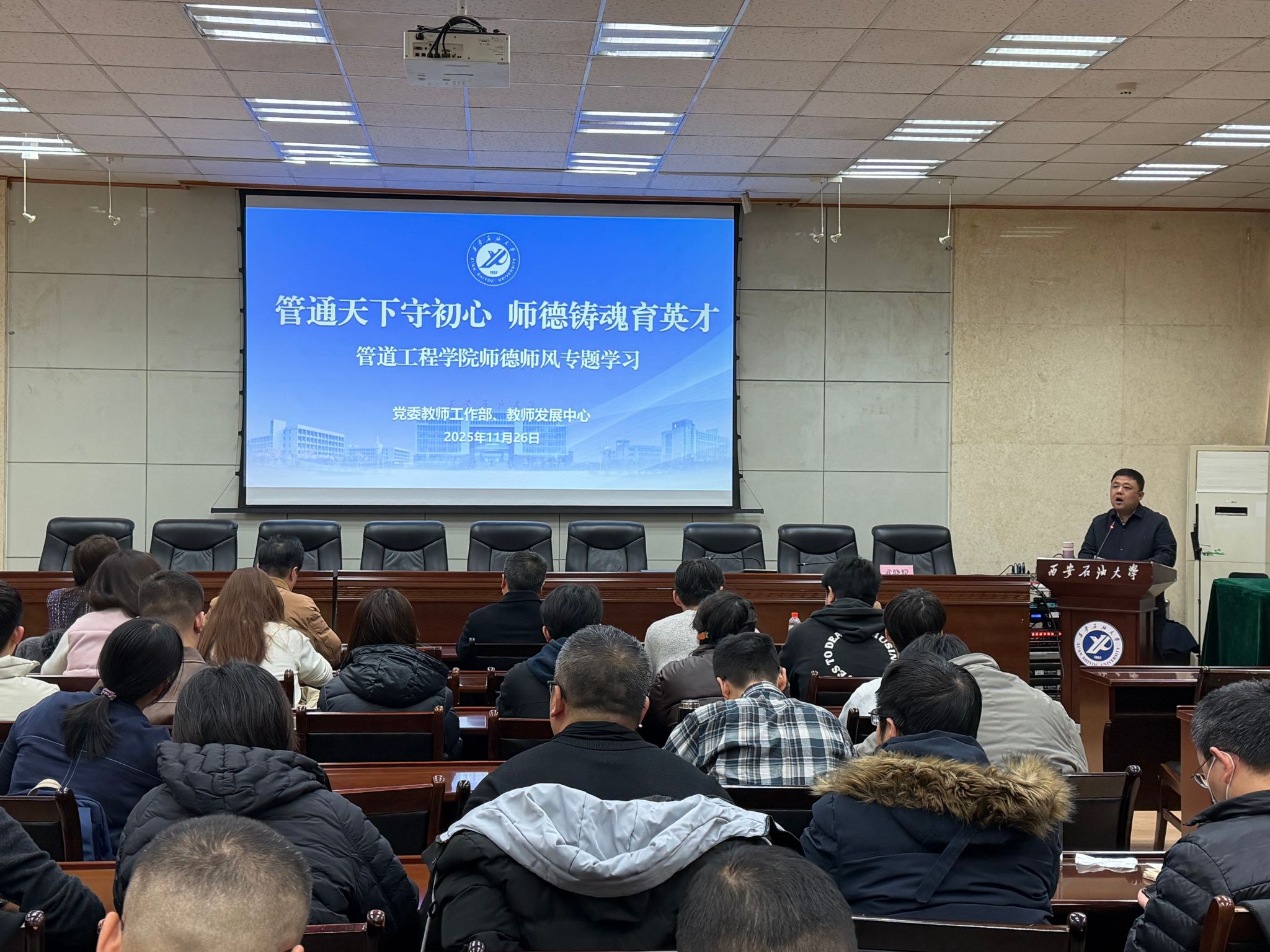 11月26日下午,由管道工程學院黨委主辦的“學黨章鑄忠誠,悟思想強使命”專題學習班第一講在雁塔校區西階第三會議室舉行。校黨委教師工作部部長、教師發展中心主任武曉朦教授擔任主講,主講題目為“管通天下守初心 師德鑄魂育英才”,學院全體教職工及研究生代表參加學習。會議由學院黨委副書記高亮主持。