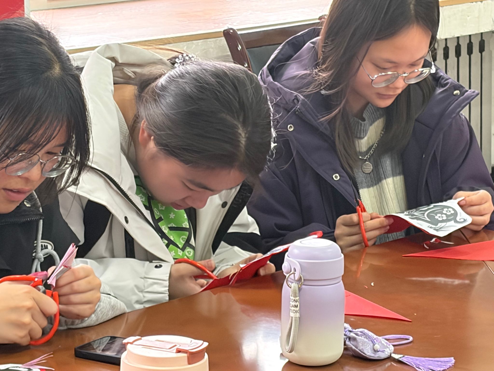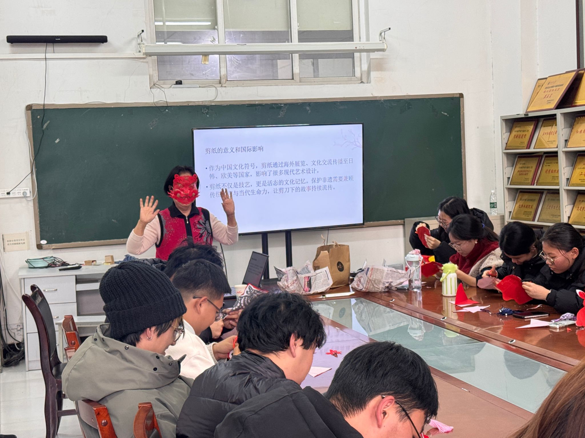 在實踐展示環節,肖志賢老人展示出令人驚嘆的剪紙技藝。只見她手中剪刀行云流水、紙屑紛飛,不過片刻,一幅幅精美靈動的圖案便躍然眼前,引來同學們陣陣歡呼。在肖老師的帶動下,大家紛紛動手嘗試,全神貫注于折紙、勾畫、裁剪之間。伴隨著剪刀起落,一朵朵紅花、一只只靈獸逐漸在指尖綻放,現場氣氛熱烈而溫馨,充滿成就感和歡聲笑語。