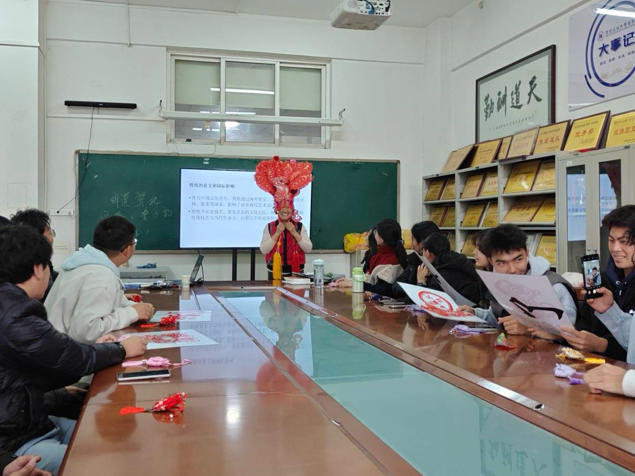活動現場,78歲的肖志賢老人以輕松幽默的語言和深入淺出的講解,為同學們系統梳理了剪紙藝術的起源、內容與地域特色。從吉祥文字到神話傳說,從十二生肖到花鳥蟲魚,她不僅生動解讀了剪紙背后的民俗信仰與生命禮俗,更以“諧音象征”為例,巧妙串聯起中國人的生活哲學與樂觀智慧。講解過程中,金句頻出、妙趣橫生,引得現場笑聲不斷,掌聲迭起。