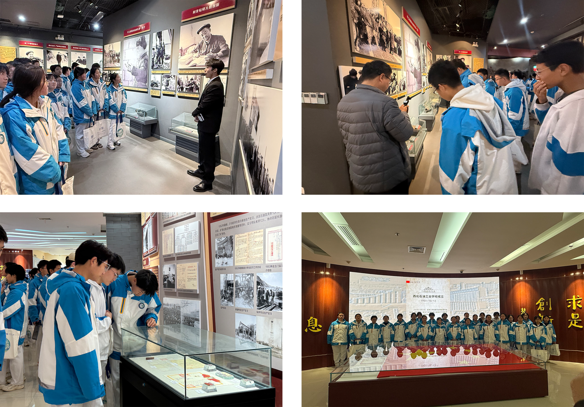 講座結束后,師生們在志愿者的引導下有序前往鐵人紀念館和校史館參觀。在參觀鐵人紀念館時,同學們被鐵人王進喜“寧可少活二十年也要拿下大油田”的英雄氣概所感染,為他身上所體現的“為國爭光、為民族爭氣”的愛國主義精神所震撼。通過珍貴的照片、陳列的實物以及講解員的講述,同學們深刻理解了鐵人的成長歷程和鐵人精神的內涵。在參觀校史館時,同學們充分了解到我校創建的歷史使命和責任擔當,深刻體會到石油人的家國情懷和奉獻精神,真切感知到“愛國奉獻、艱苦奮斗、科學求實、開拓進取”的辦學精神,這種沉浸式的學習體驗,不僅加深了同學們對我校校園文化的理解,也進一步堅定了他們考入理想大學的信心與決心。