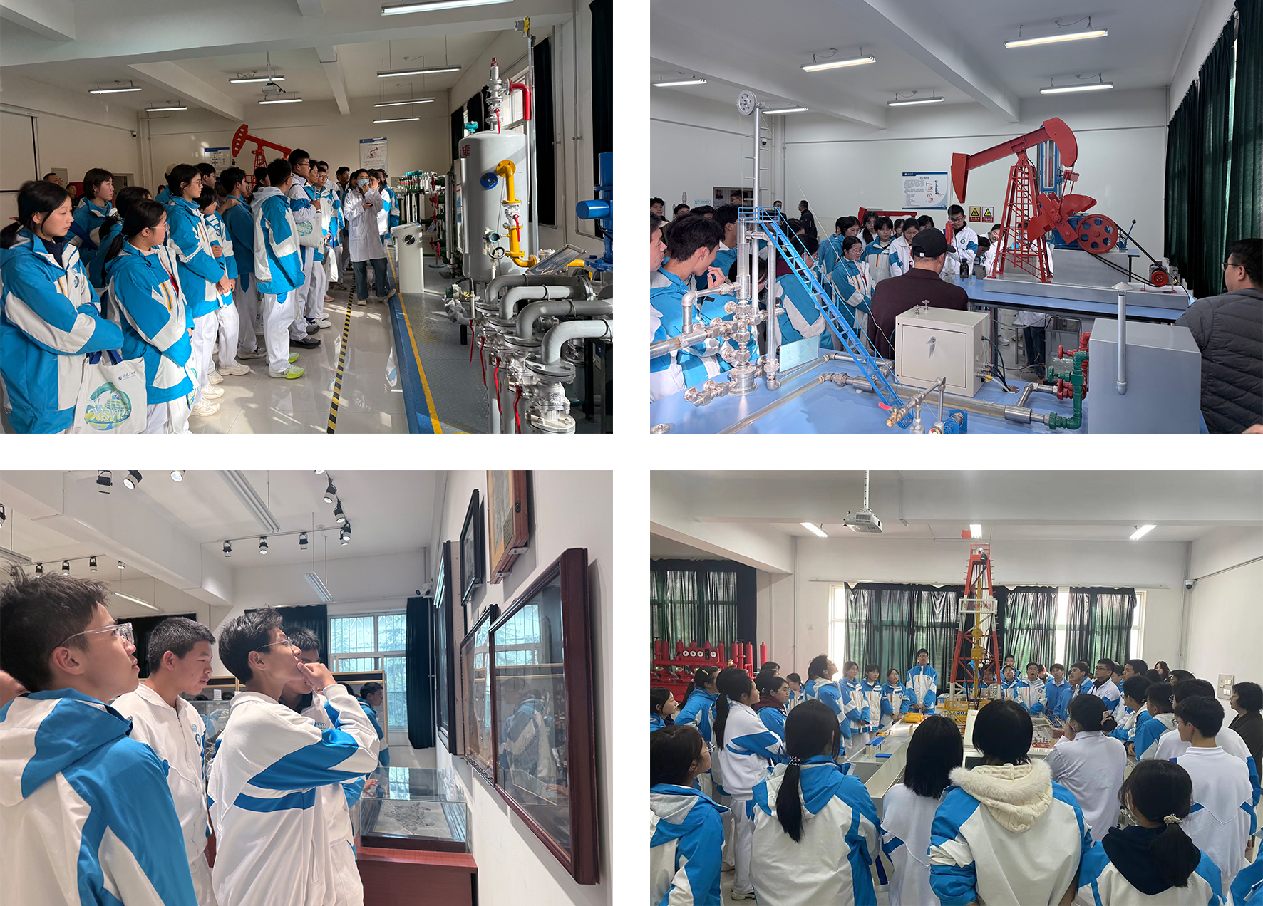 在我校陜西省石油石化科普基地,同學們依次參觀了鉆井實訓室、地質標本實訓室、采油實訓室、油氣分布沙盤以及集輸、煉化等多個實訓教學區。參觀過程中,同學們認真聆聽講解,仔細觀察設備演示,積極思考技術原理,并踴躍參與互動交流。通過這種直觀生動的現場教學,大家對石油天然氣的勘探、開發、儲運和加工等全產業鏈環節有了初步認識,深刻感受到能源領域的廣闊前景,進一步激發了在相關領域深入學習、未來在國家能源事業中實現自我價值的志向。