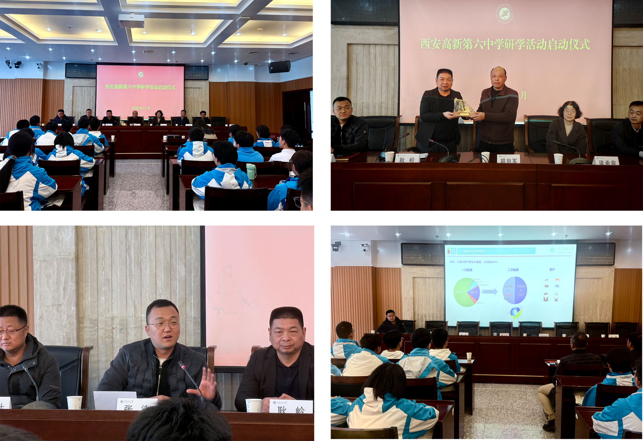 啟動儀式上,耿嶺代表學校對高新區第六高級中學師生代表的到來表示熱烈歡迎,并詳細介紹了學校的歷史沿革、專業特色和教學科研等方面的情況。他希望同學們通過近距離體驗大學生活,感知科研的嚴謹與魅力,體悟“為國找油,為民族爭氣”的崇高使命,將所見所聞內化為學習的強勁動力,堅定目標,腳踏實地,努力成長為建設國家的棟梁之才。接著,耿嶺代表學校向中學贈送了抽油機模型,寄托了兩校友誼長存、共育英才的美好期望。隨后,張浩介紹了學校的招生政策和本次研學活動的具體安排。啟動儀式結束后,雒設計為高中同學們帶來了題為《馭光氫之“能”定國器之“材”》的科普講座,圍繞為什么發展氫能、氫能的內涵、發展現狀以及廣闊前景四個方面,系統闡釋了氫能的前世今生與未來趨勢。