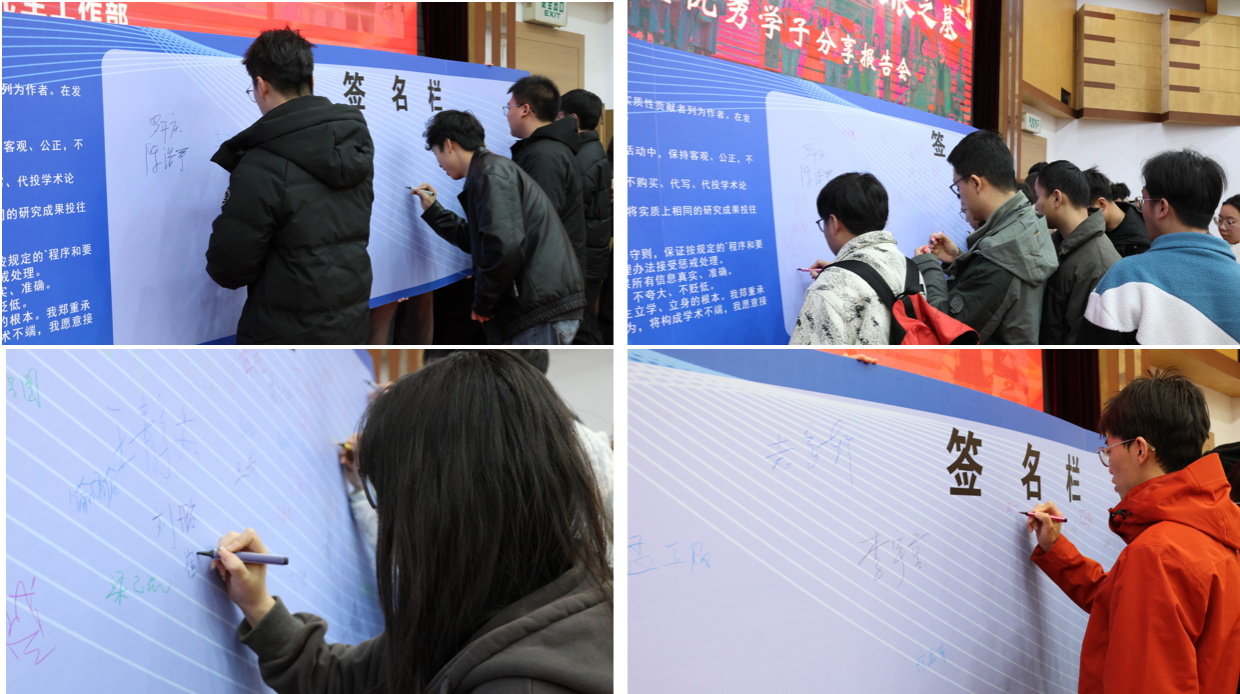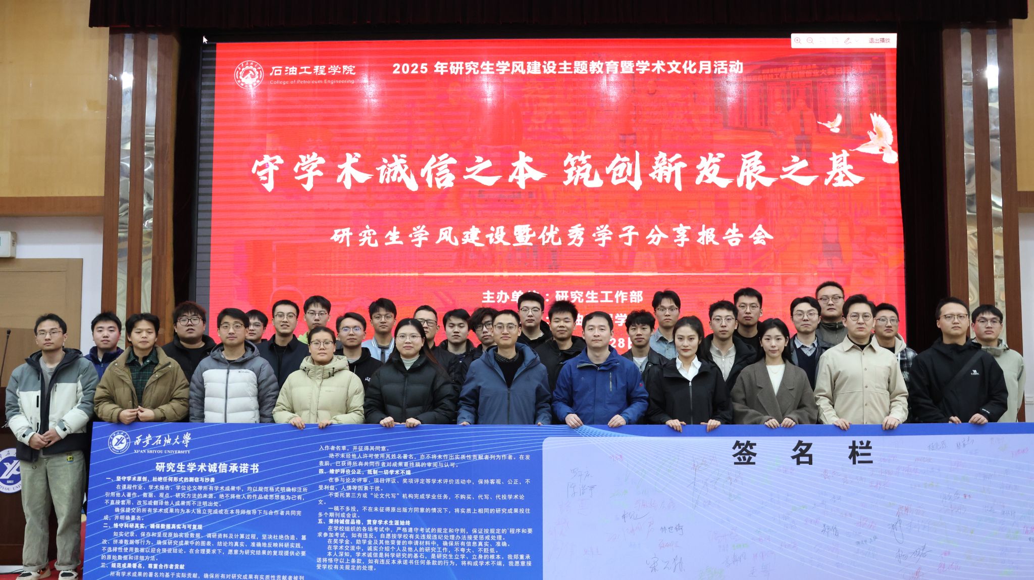 最后,石油工程學院研究生輔導員宋興淼在會上為全體研究生通報了近期全國高校中發生的學術不端案例,開展學術誠信警示教育,全體研究生依次簽署學術誠信承諾書并合影留念。