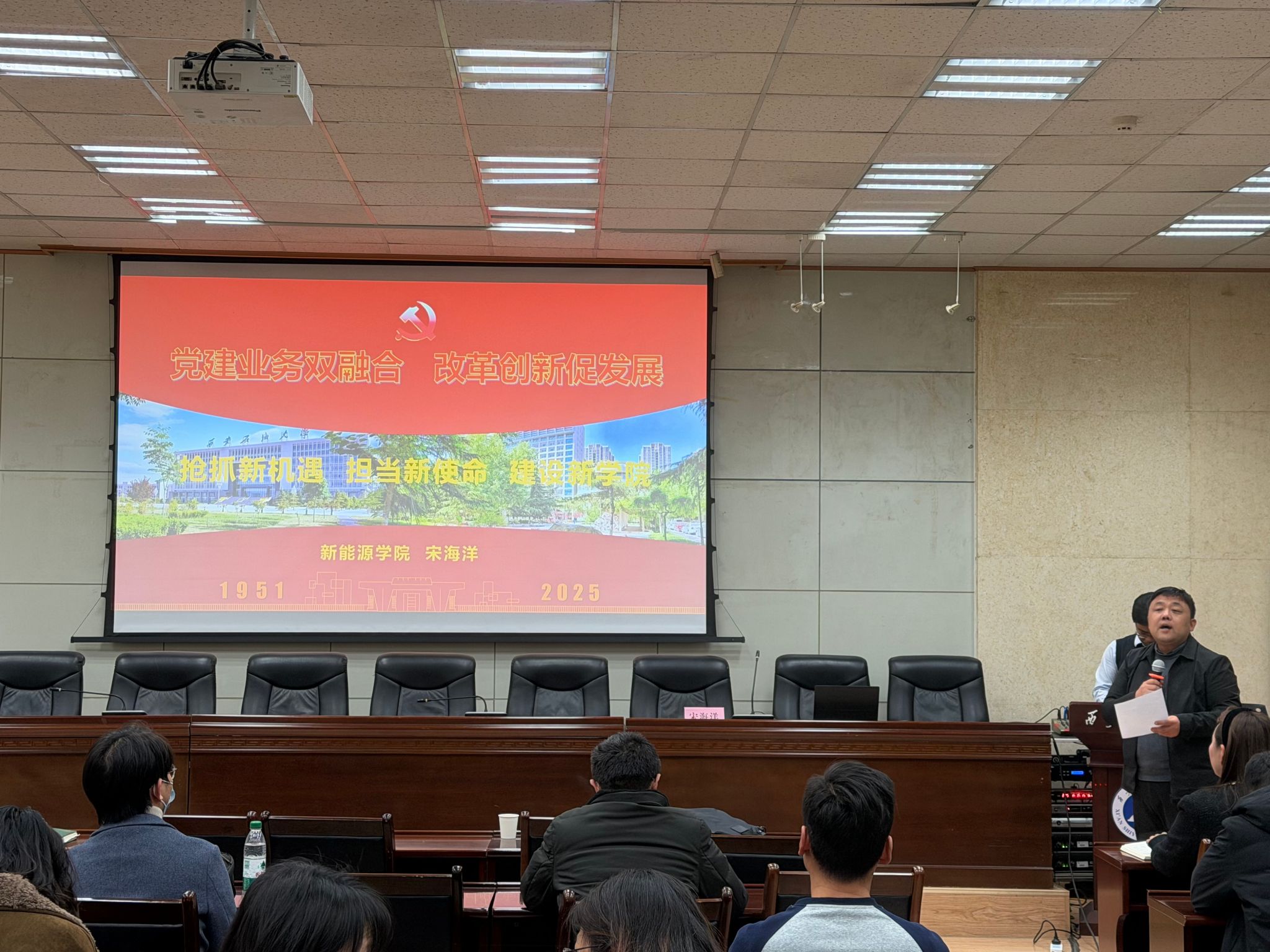 12月10日下午,管道工程學院黨委在雁塔校區西階第三會議室開展了“學黨章鑄忠誠,悟思想強使命”專題學習班第三講。本次課程由新能源學院院長宋海洋教授講授,主題為“黨建業務雙融合,改革創新促發展-搶抓新機遇,擔當新使命,建設新學院”,學院全體教職工、研究生黨員代表共70余人參加學習。學習由學院黨委副書記高亮主持。