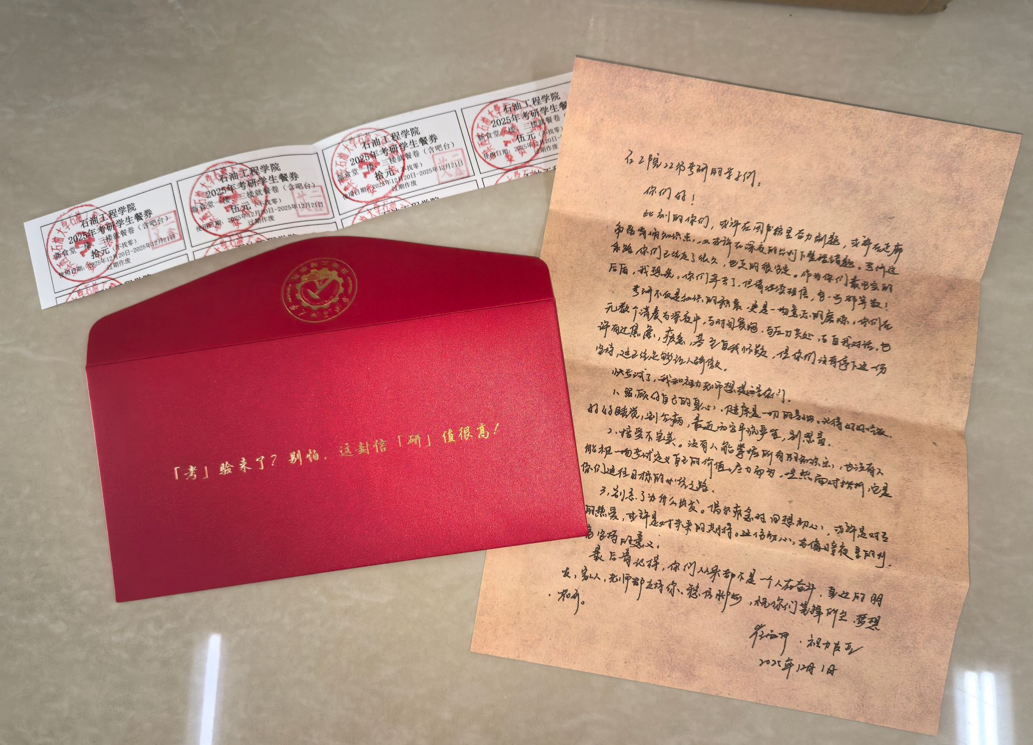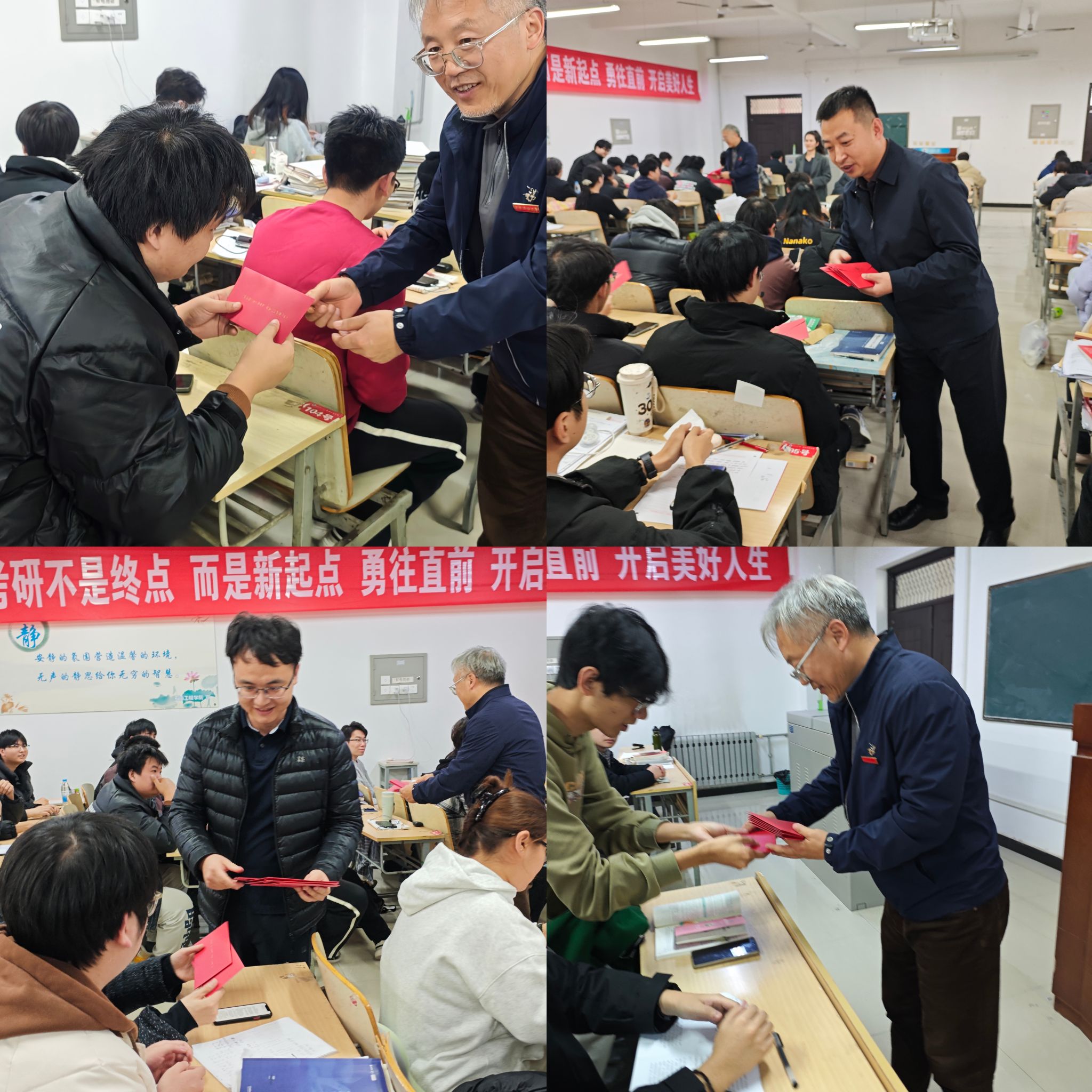 活動上,學院領導與老師們將飽含期許的禮物親手遞至備考學子手中,一封紅色信箋寄寓“鴻”運當頭之祝愿,封面“考研錦囊”字樣凝結智慧,封口處院徽如印,靜靜烙下學院的牽掛與囑托。考慮到考試期間通訊與用餐多有不便,學院特備暖心餐票,護航學子安心落筆,尤為珍貴的是,2026屆畢業班輔導員為每位考生親筆書寫信函,字里行間流淌真情,紙短情長蘊藏深意,讓溫暖的陪伴跨越考場內外,成為每一位學子身后無聲卻堅實的港灣。