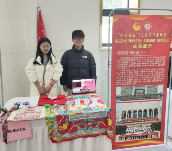 在實踐成果展示環節,我校展位通過精心制作的宣傳展板和生動豐富的實踐活動資料,全面呈現了我校近年來在實踐育人方面取得的扎實成果。特別是我校學生基于延安社會實踐成果自主設計的絲巾、帆布包、文化衫、卡套等系列文創產品,將紅色文化基因與青年創意設計相融合,以生動鮮活的實物形態展現出革命圣地的文化魅力與我校學子的精神風采,吸引了眾多領導、嘉賓和兄弟院校師生的駐足欣賞與交流,成為展會現場備受關注的亮點之一,獲得了廣泛贊譽。