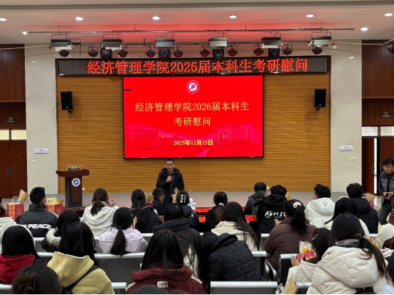 時值考研沖刺階段,為關懷備考學生,營造溫暖向上的育人氛圍,12月15日,經濟管理學院在崇文樓118多功能廳舉行“研途送暖,‘經’心護航”考研學子考前慰問活動。學院黨委書記張凌寒、副書記趙紀飛、副院長董春詩、李春霄,學生工作辦公室副主任張碩以及2026屆輔導員任仰、王業林與全體考研學子齊聚一堂,為奮戰在備考沖刺階段的同學們送上溫情關懷與誠摯祝福。