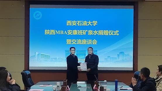 2025年12月14日下午,西安石油大學陜西MBA安康班礦泉水捐贈儀式暨交流座談會在雁塔校區會議中心隆重舉行。經濟管理學院黨委書記張凌寒、院長吳勛等領導班子成員,陜西MBA安康班班主任趙倩、學員代表安康市漢濱區委組織部部長向成城及班委共同出席活動。儀式由經濟管理學院副院長李春霄主持。