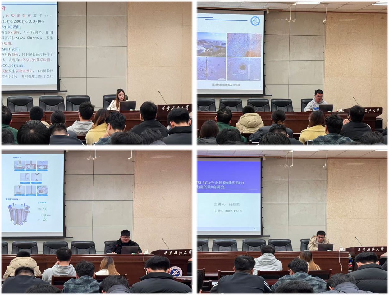 論壇中,四位主持創新基金項目的2023級碩士研究生,結合各自立項課題進行了系統匯報與深度分享。安海娟從原子尺度揭示了氫在管線鋼表面的吸附機制;劉洢辰聚焦微生物腐蝕,探索基于生物競爭的綠色抑腐路徑;肖輝致力于開發高熵鈣鈦礦材料,以提升固體氧化物燃料電池的陰極性能;呂嘉鰲研究了陶瓷增強鋁硅銅合金的顯微組織調控與力學性能優化。匯報內容覆蓋能源材料、腐蝕防護以及復合材料等多個前沿方向,充分展現了我院研究生在創新基金支持下的科研實踐能力與創新思維。