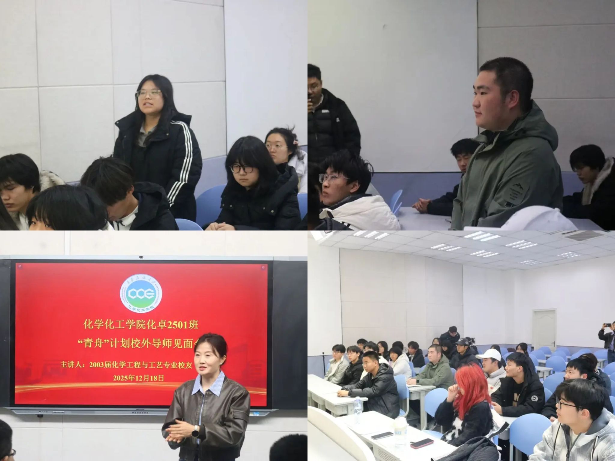 為深耕產教融合育人生態,構建校﹣企﹣校友協同賦能體系,精準錨定學子學業深耕與職業遠航的核心需求,化學化工學院日前線上舉行”青舟”計劃校友導師聘任儀式,12月18日,萬里和蔡乾鋒兩位校友專程趕赴新校區和學生進行線下分享交流。學院黨委書記孫會珠、副院長李善建、2023級輔導員白婷、2025級輔導員陳雨露及學生代表一同參加,活動由學院黨委副書記喬曉主持。