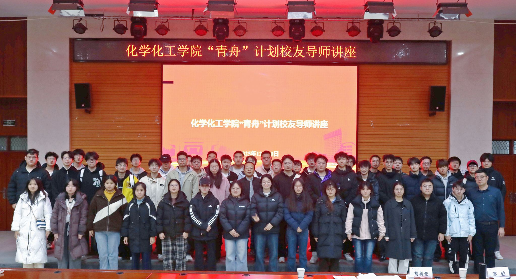 12月20日,化學化工學院“青舟”大講堂第三期在鄠邑校區崇文樓118室精彩開獎。中海油渤海自營油田技術服務中心副經理蘇馳、我院2005屆校友,長慶油田安全環保高級工程師胡科先、2005屆校友,兩位“青舟”兩位校友專程利用周六時間趕赴學校,為2023級本科同學傳經送寶。