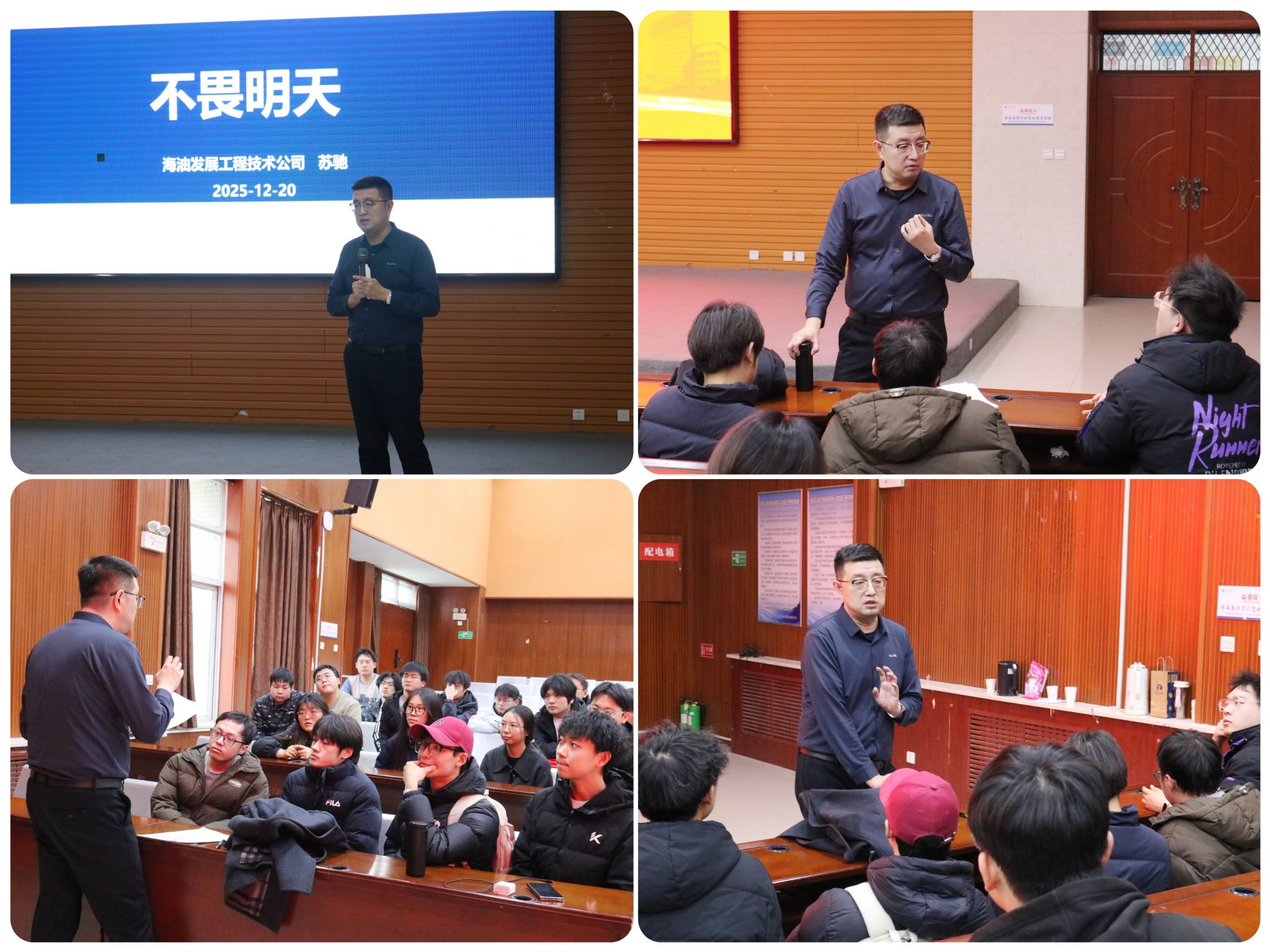 蘇馳校友以“300余天出海一線”的親身經歷破題,將化工藥劑現場服務的實操細節、生產管理的統籌邏輯娓娓道來;同時分享了自己兼任團委書記、新員工思想導師的8年心得,“把每一份工作做透,就是成長的底氣”的感悟,讓同學們真切感受到化工從業者的責任與溫度。他的奮斗歷程為同學們帶來深刻啟示:一是要珍惜在校實踐機會,學生時代的組織管理、團隊協作經歷,都是未來職場的寶貴積淀;二是要敢于走出舒適區,面對未知挑戰不必退縮,基層一線的磨礪正是快速成長的階梯;三是要永葆攻堅克難的韌勁,行業發展從無坦途,唯有以專業為底氣、以堅持為支撐,才能破解難題、創造價值;四是要樹立長遠格局,將個人發展與行業需求、國家能源事業緊密結合,在實干中實現人生價值。