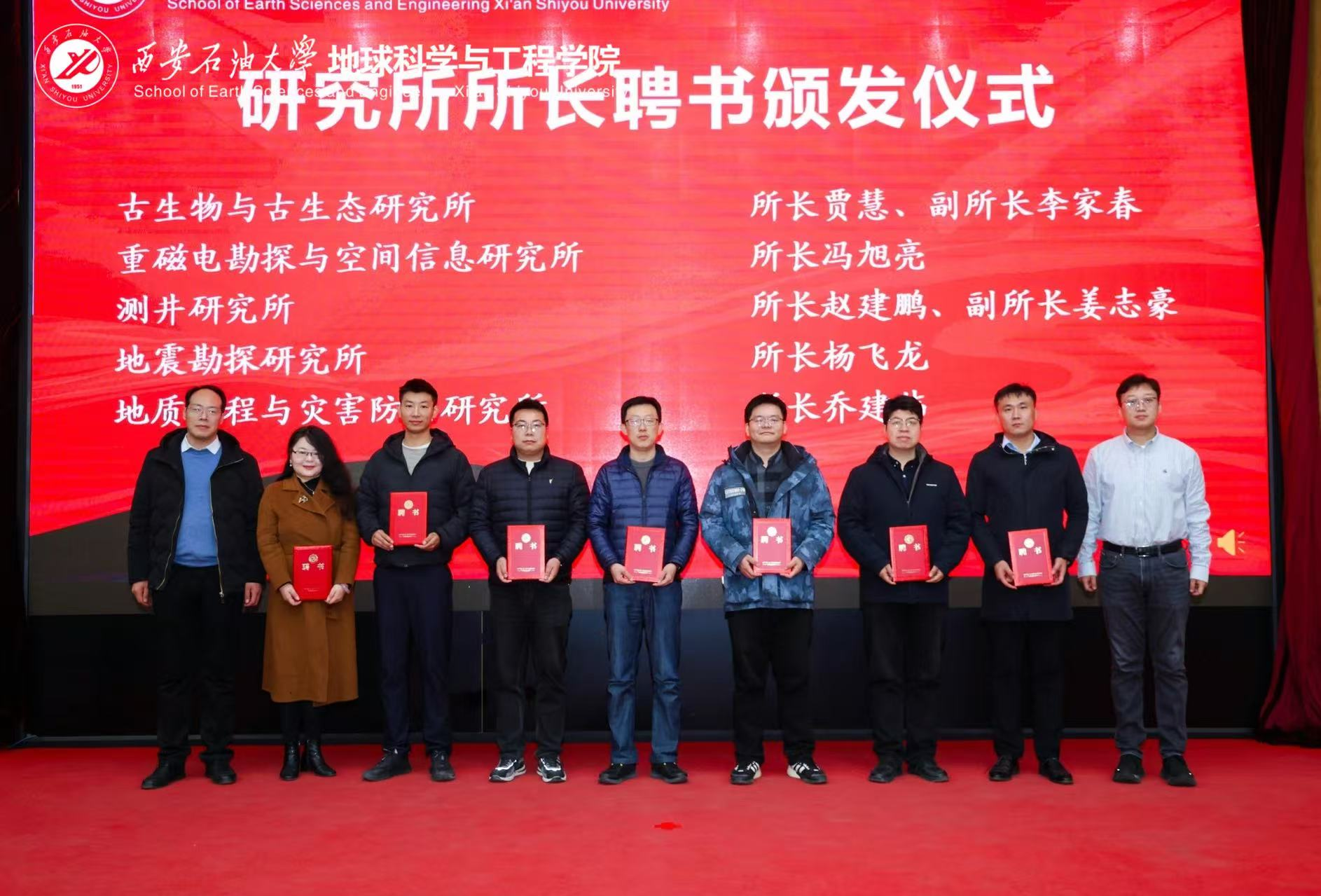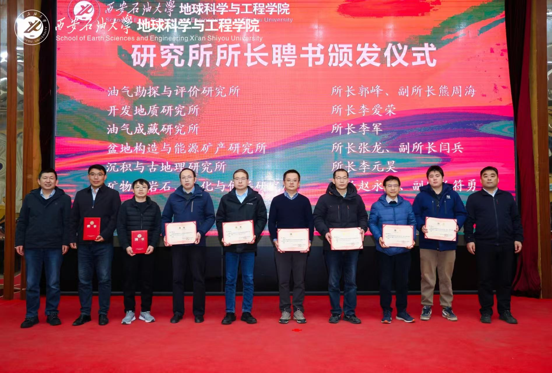學院院長宋立軍宣讀了學院新一屆研究所所長聘任決定,學院領導分批為新組建的油氣地質研究所、沉積與古地理研究所等11個研究所的15位新任所長頒發了聘書。