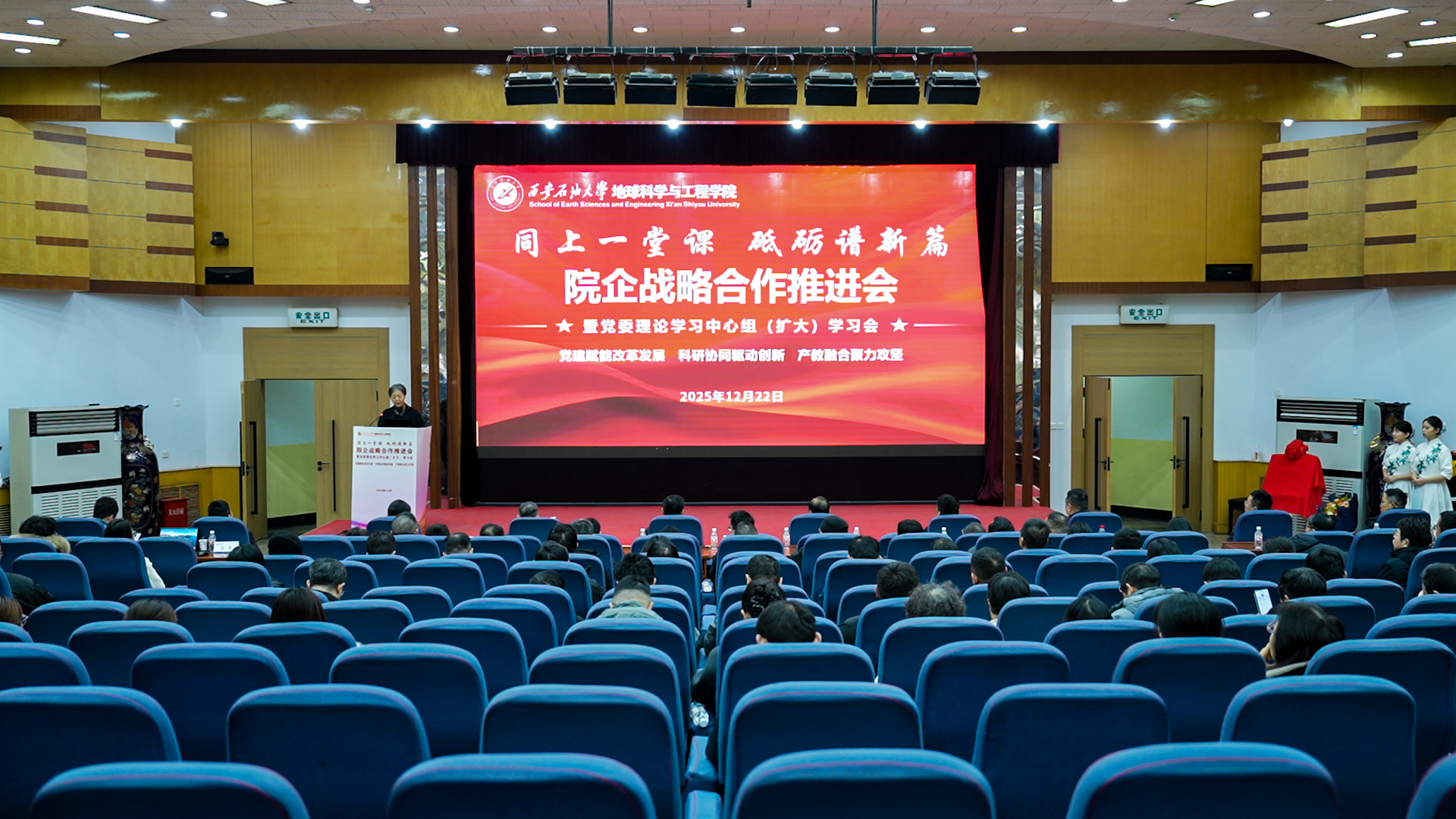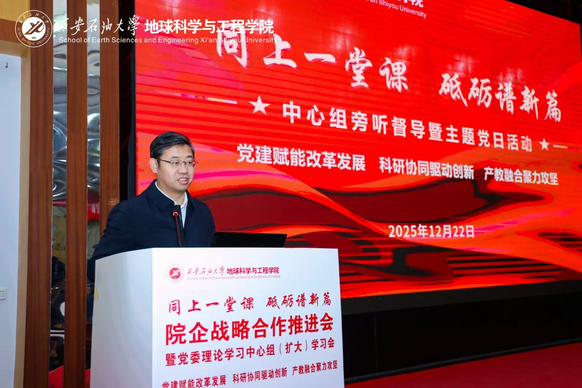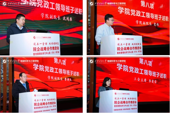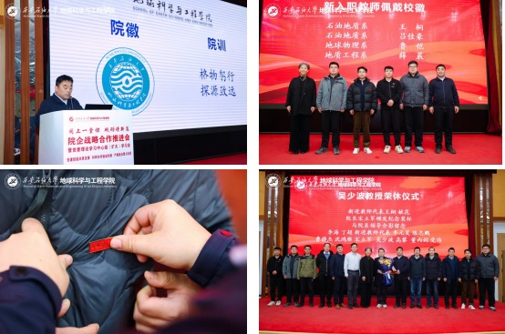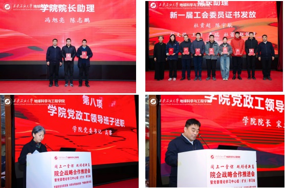為貫徹落實學校“三個年”建設部署,深化“院所制”改革,12月22日,地球科學與工程學院“同上一堂課 砥礪譜新篇”院企戰略合作推進會暨黨委理論學習中心組(擴大)學習會在雁塔校區舉行。會議以“黨建賦能改革發展,科研協同驅動創新,產教融合聚力攻堅”為主線,通過聯合研究院揭牌、前沿學術報告、專題思政課與學院內部建設系列議程,匯聚發展共識,擘畫未來藍圖。校長王進富,長慶油田首席技術專家喻健,西安石文軟件有限公司董事長、總經理張小會,副總經理楊靜波,校友工作與合作交流處相關負責人等校企嘉賓及全院師生代表共同參會。學院黨委書記高黎主持會議。