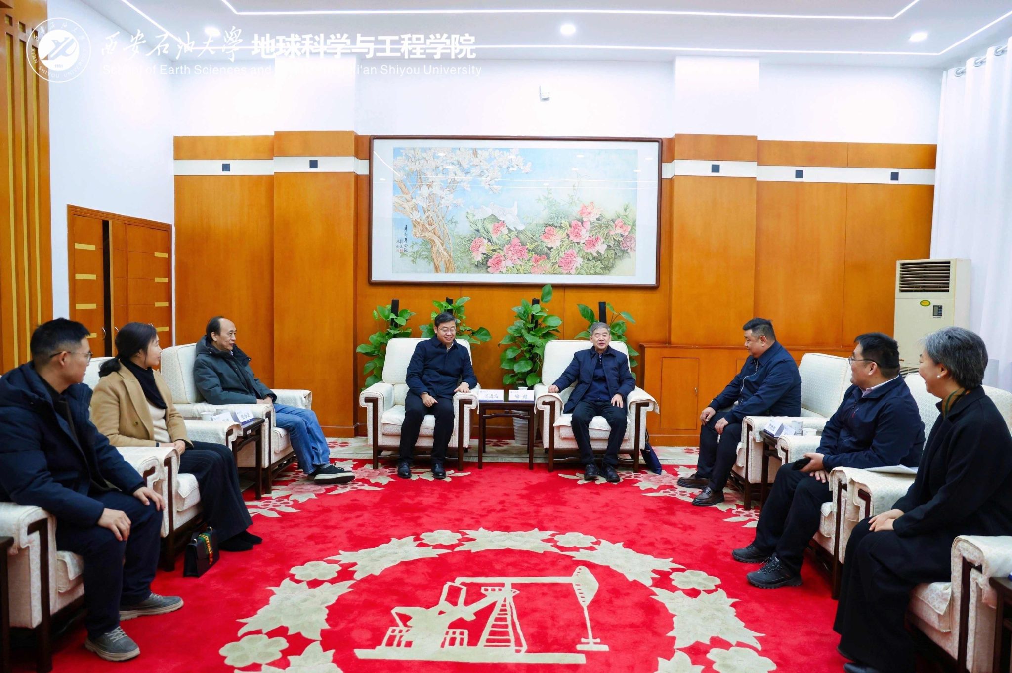 會前,王進富在貴賓室會見了喻健、張小會一行,并圍繞深化產教融合、服務國家能源戰略、培養行業急需人才等進行了深入交流,就推動聯合研究院做實做強達成共識。校友工作與合作交流處、地球科學與工程學院陪同會見。