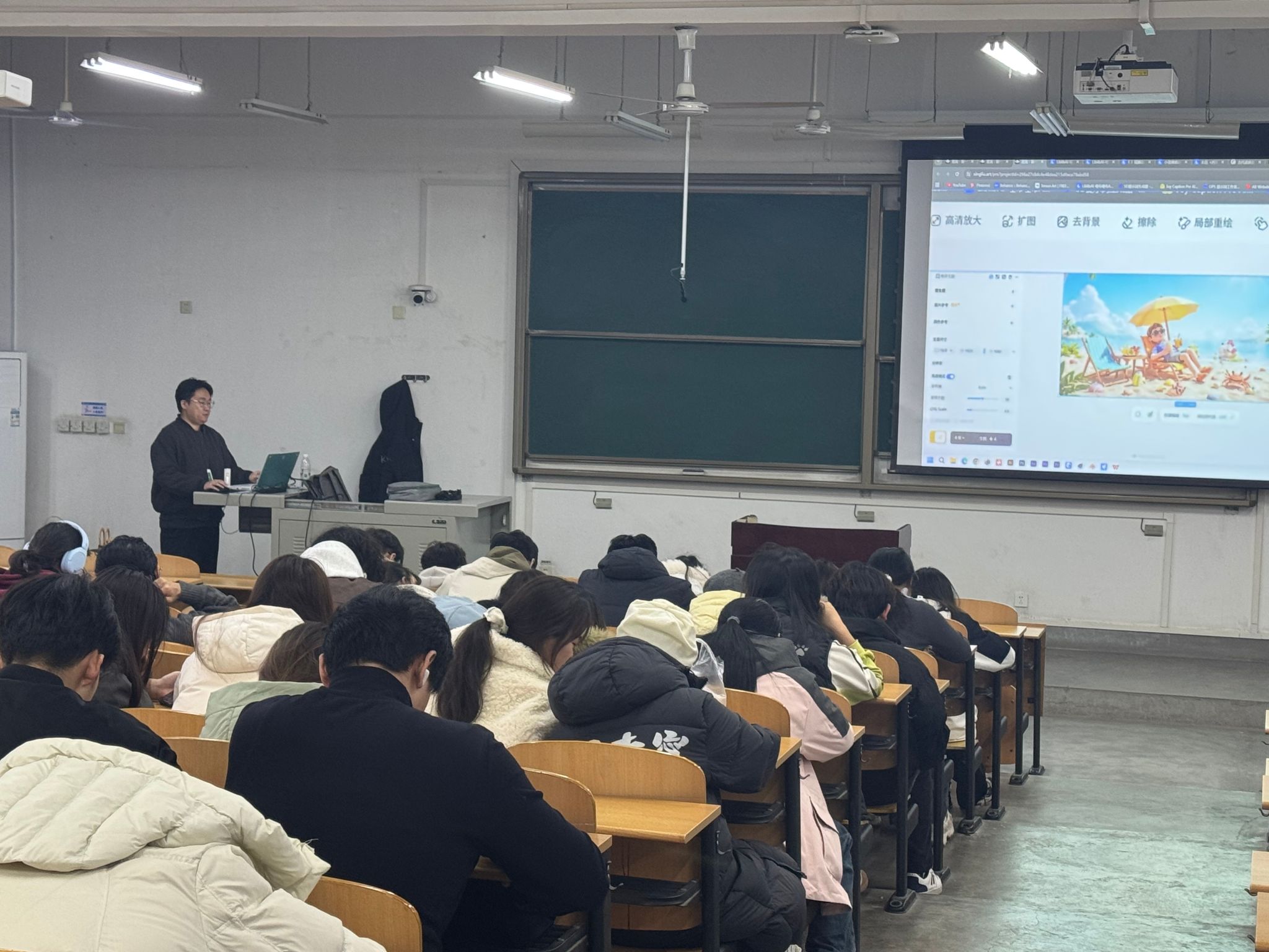 講座中,主講人結合豐富案例,圍繞設計類專業學生關注的核心問題展開講解,內容分為四大板塊:一是分析視覺傳達、環境設計等專業當前的就業方向與市場需求,明晰行業人才標準;二是聚焦“人工智能是否將替代設計行業”的熱點話題展開深入探討,引導學生理性看待技術變革;三是系統講解人工智能技術在設計領域的實際應用場景與現代化工作流程,拆解AIGC輔助設計的實操要點;四是結合行業發展趨勢,闡述高質量就業所需的核心能力與素質準備,為學生的技能提升指明方向。