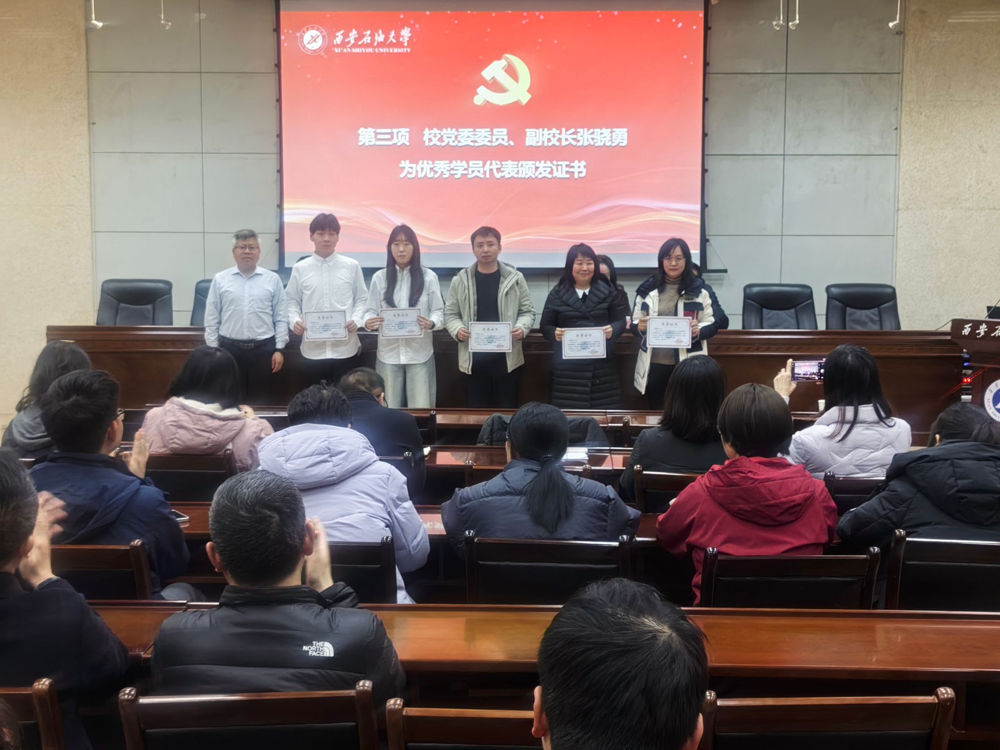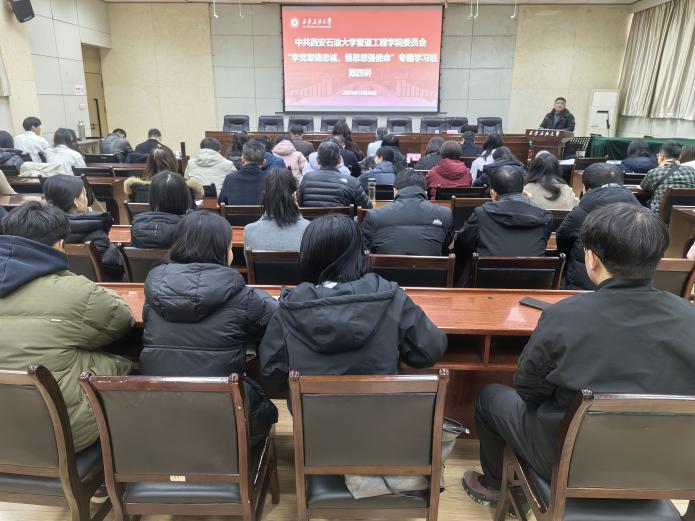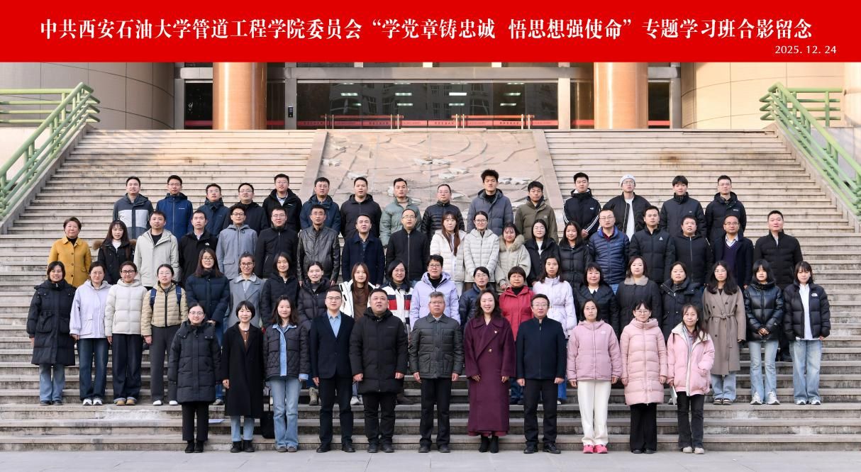 2025年12月24日下午,管道工程學院黨委在雁塔校區西階第三會議室開展“學黨章鑄忠誠,悟思想強使命”專題學習班第四講暨結業儀式。校黨委委員、副校長張驍勇出席并作第四講專題報告,學院班子全體成員、全體教工黨員、研究生黨員代表70人參加儀式。儀式由學院黨委副書記高亮主持。