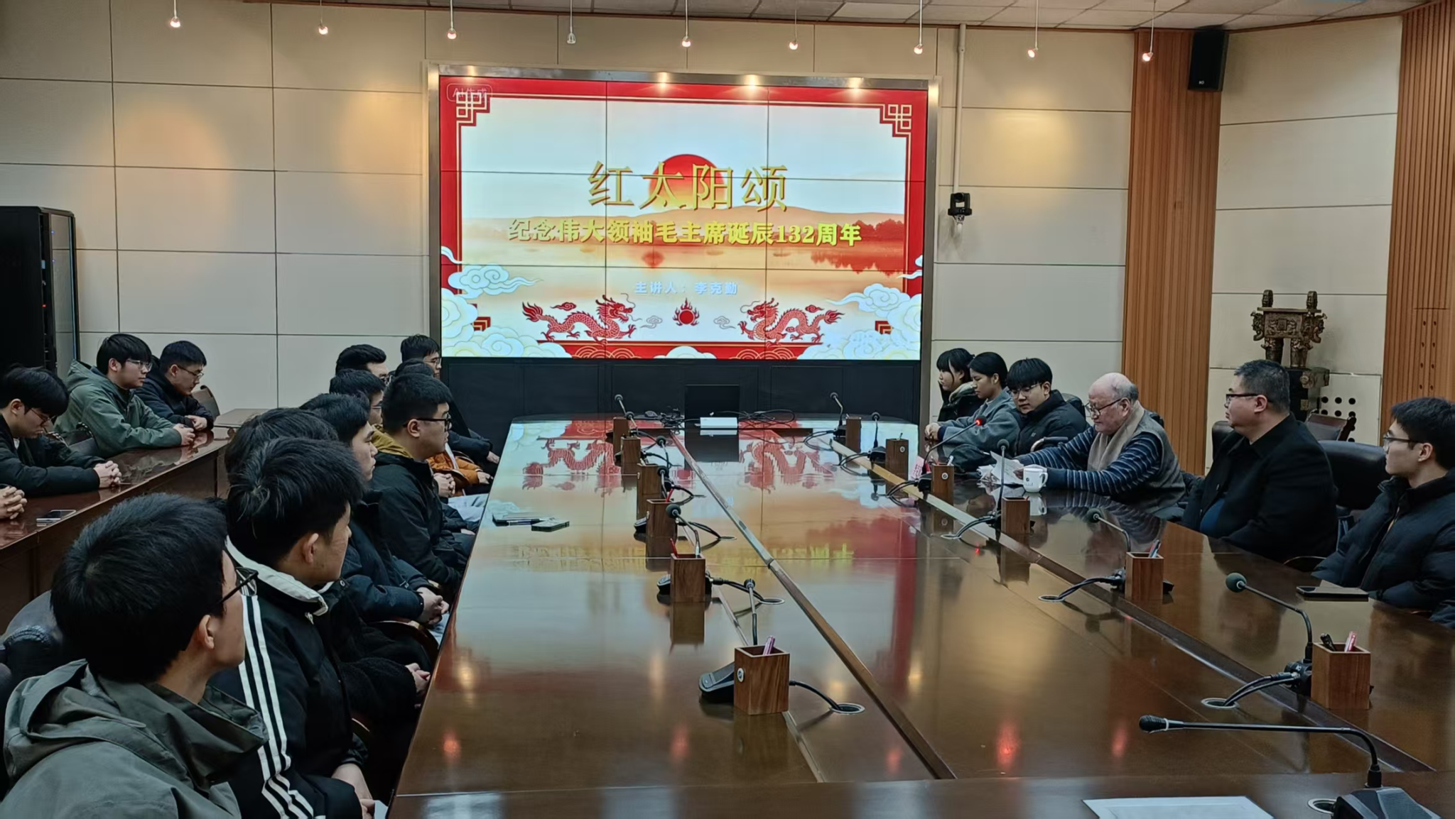 12月26日下午,在雁塔校區會議中心第二會議室,離退休教職工李克勤書記以“紅太陽頌”為主題,在紀念偉大領袖毛澤東主席誕辰132周年之際,為機械工程學院研究生代表奉獻了一場兼具思想性、指導性與趣味性的分享會,由離退休工作處副處長趙海濤主持。