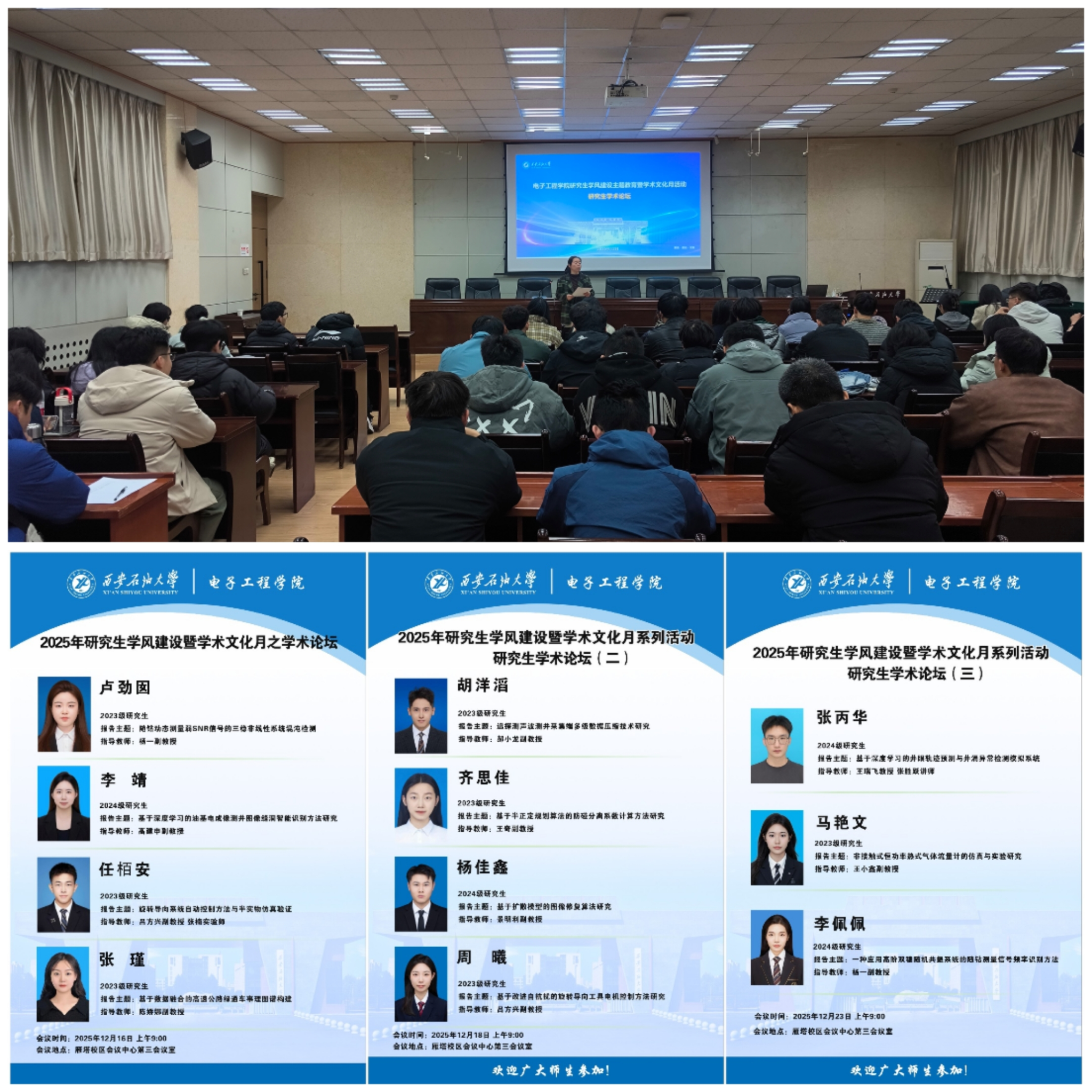 按照學校研究生工作部關于2025年研究生學風建設暨學術文化活動月的安排部署,電子工程學院緊扣“守學術誠信之本 筑創新發展之基”核心主題,立足學科特色與研究生培養需求,于2025年11月-12月扎實開展研究生學風建設主題教育暨學術文化月系列活動,將政治引領、學術交流、升學就業等內容深度融合,形成了“黨建引領、學術賦能、育管并重”的學風建設新格局。