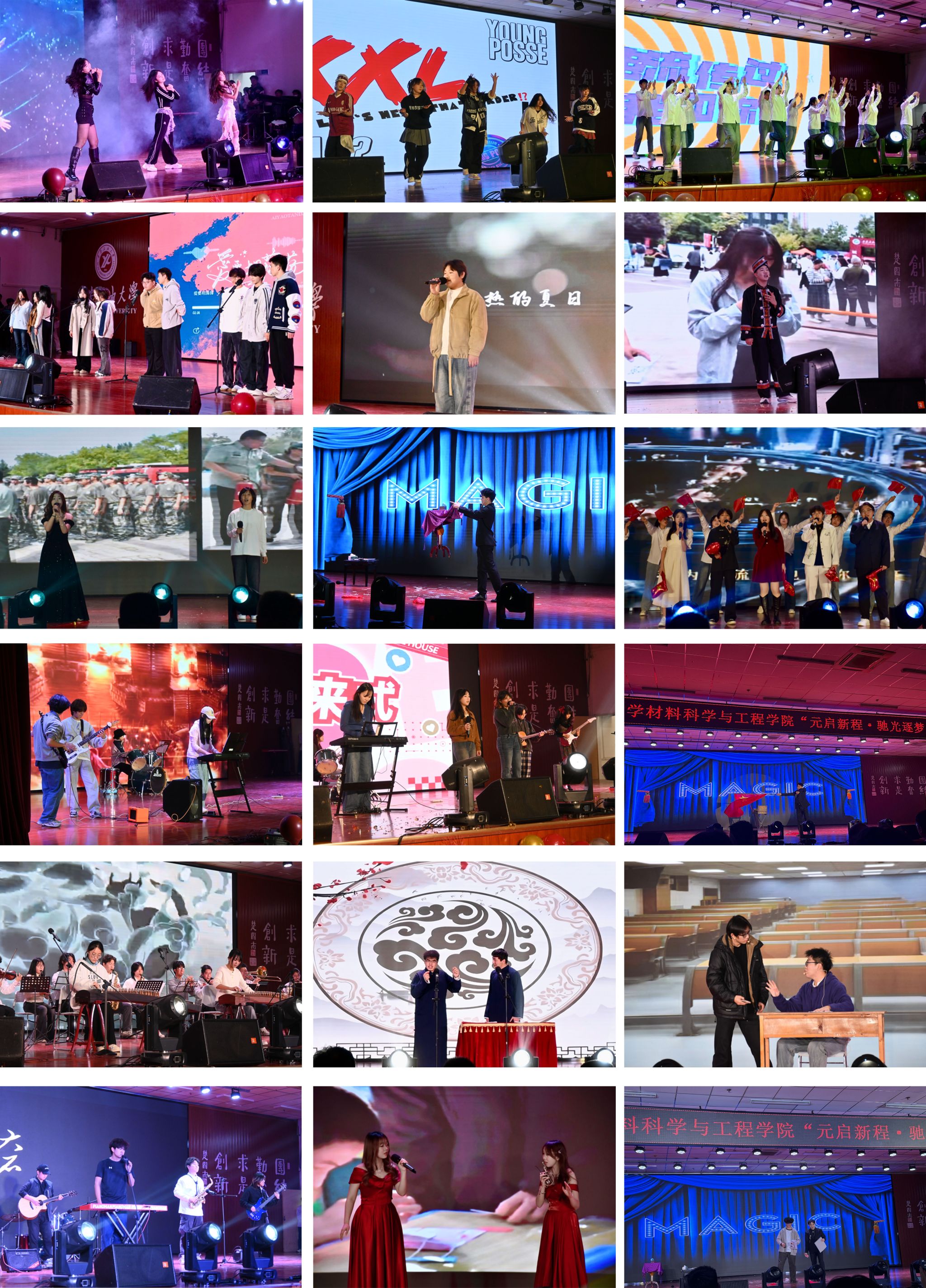 晚會圍繞“元啟新程 馳光逐夢”主題,將青春活力與奮進姿態貫穿始終。舞蹈《Focus》《Golden》《XXL》《你要跳舞嗎》節奏強勁、朝氣蓬勃,瞬間點燃全場熱情;歌曲《愛要坦蕩蕩》《我的美麗》《我愛你中國》旋律動人、情感真摯,贏得陣陣掌聲;樂隊演繹《曹操》《云宮迅音》《大石碎胸口》《我的未來式》風格多樣、演奏精彩,帶來別具一格的視聽享受;相聲《我是大學生》與小品《考場“誠”風記》妙趣橫生、笑聲不斷,將晚會氣氛推向高潮。整場演出精彩連連,歡呼與掌聲交織,暖意洋溢全場。