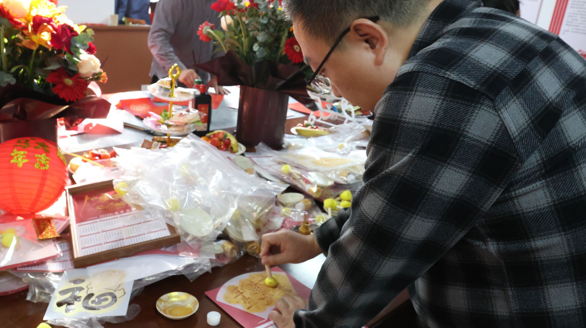 “揮毫迎春,舞墨送福”環(huán)節(jié)中,邀請(qǐng)知名書家現(xiàn)場(chǎng)揮毫潑墨,為教職工書寫寓意美好的新春對(duì)聯(lián),一筆一畫間承載著濃濃的新春祝福與文化底蘊(yùn),引得大家紛紛駐足領(lǐng)取。
