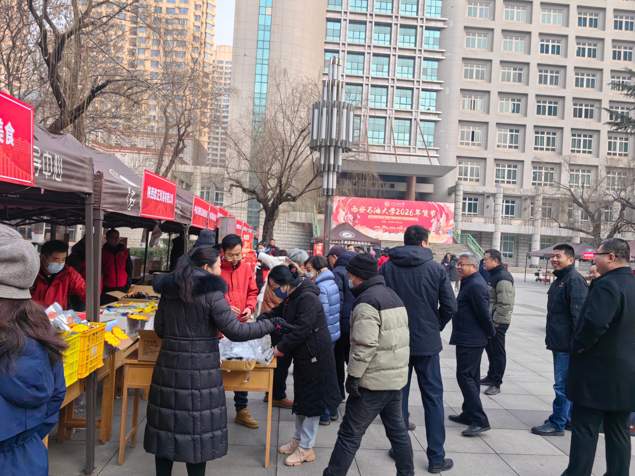 歲末寒意濃,校情暖人心。為深入落實校黨委“以教職工為中心” 的發(fā)展理念,將 “幸福西石大” 建設要求轉(zhuǎn)化為看得見、摸得著的民生福祉,1 月23日,由校工會、后勤處、離退休工作處、石大資產(chǎn)經(jīng)營公司聯(lián)合承辦的2026 年春節(jié)教職工專屬年貨節(jié)在我校雁塔校區(qū)圓滿舉辦。校黨委副書記程永清,副校長張驍勇、趙健等校領導親臨現(xiàn)場巡展,與教職工親切互動,共品年味、共話發(fā)展。本次活動以“品質(zhì)優(yōu)、價格惠、服務暖、文化濃” 的鮮明特色,成為校黨委心系教職工、服務教職工的生動實踐。