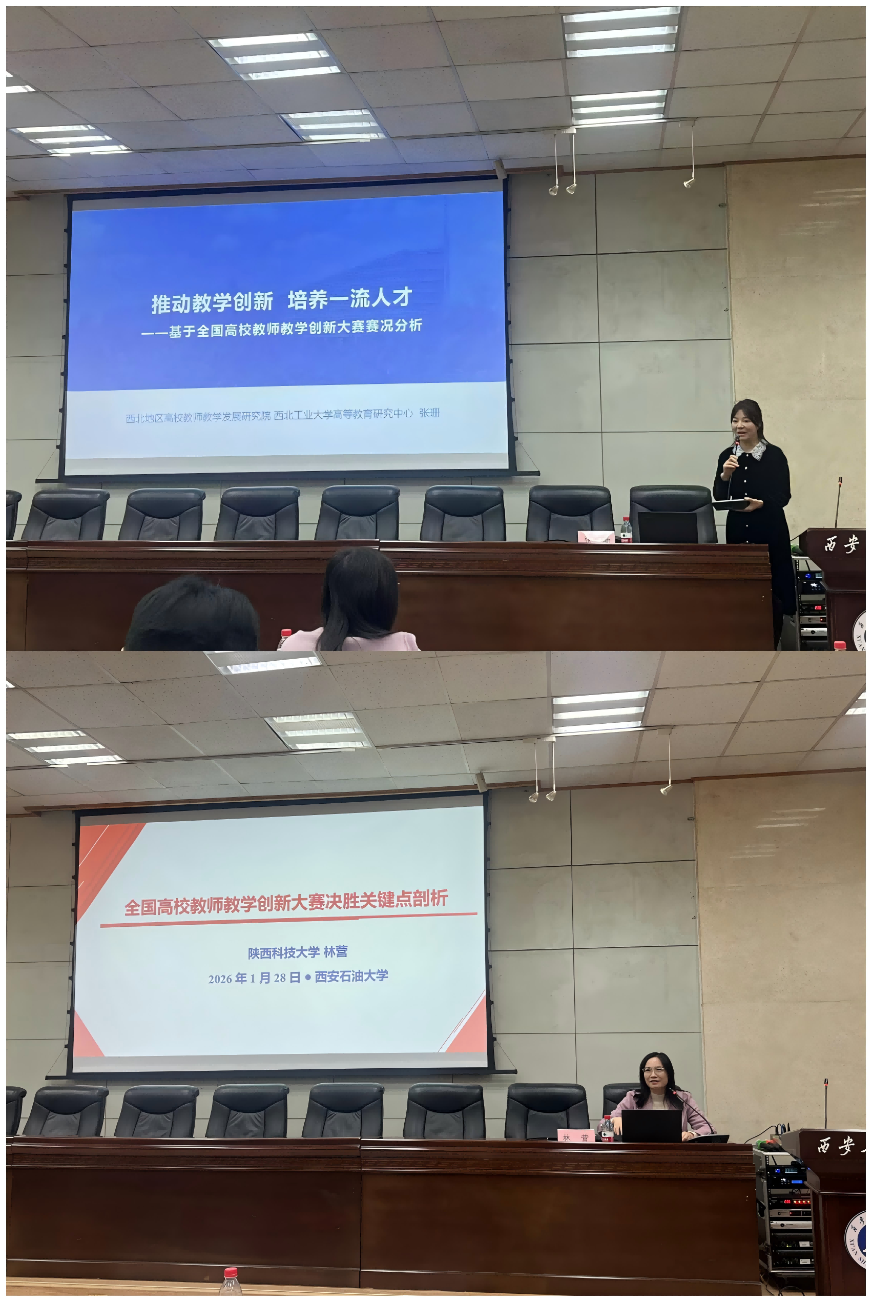 隨后,兩場(chǎng)專題報(bào)告為在場(chǎng)教師帶來了前沿教學(xué)創(chuàng)新思路。西北工業(yè)大學(xué)張珊老師以《推動(dòng)教學(xué)創(chuàng)新 培養(yǎng)一流人才—基于全國高校教師教學(xué)創(chuàng)新大賽賽況分析》為題,結(jié)合全國賽事最新動(dòng)態(tài),深入剖析了當(dāng)前教學(xué)創(chuàng)新的趨勢(shì)與方向,用鮮活案例展現(xiàn)了創(chuàng)新教學(xué)對(duì)人才培養(yǎng)的賦能作用;陜西科技大學(xué)林營教授作為全國高校教師教學(xué)創(chuàng)新大賽一等獎(jiǎng)獲得者,以《全國高校教師教學(xué)創(chuàng)新大賽決勝關(guān)鍵點(diǎn)剖析》為主題,從參賽材料打磨、課堂教學(xué)設(shè)計(jì)、成果展示技巧等核心環(huán)節(jié)入手,分享了備賽過程中的實(shí)戰(zhàn)經(jīng)驗(yàn)與避坑指南,為教師們精準(zhǔn)發(fā)力提供了寶貴借鑒。