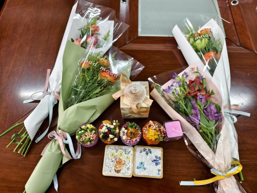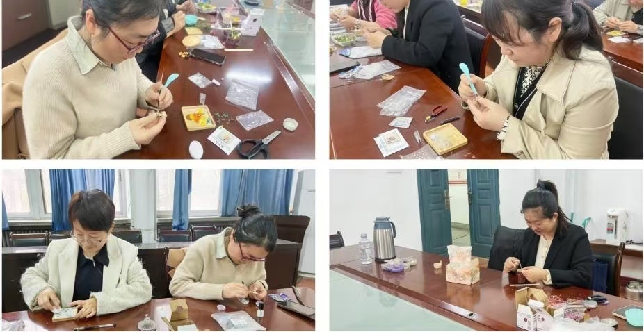 活動中,女教職工們迅速投入創(chuàng)作:香薰蠟燭制作區(qū),大家調(diào)配精油、點(diǎn)綴干花,打造專屬香氛;杯墊制作區(qū),將彩珠與軟木底座巧妙結(jié)合,兼具實(shí)用與美感;胸針制作區(qū),細(xì)致拼接出風(fēng)格各異的精致配飾,盡顯細(xì)膩聰慧。