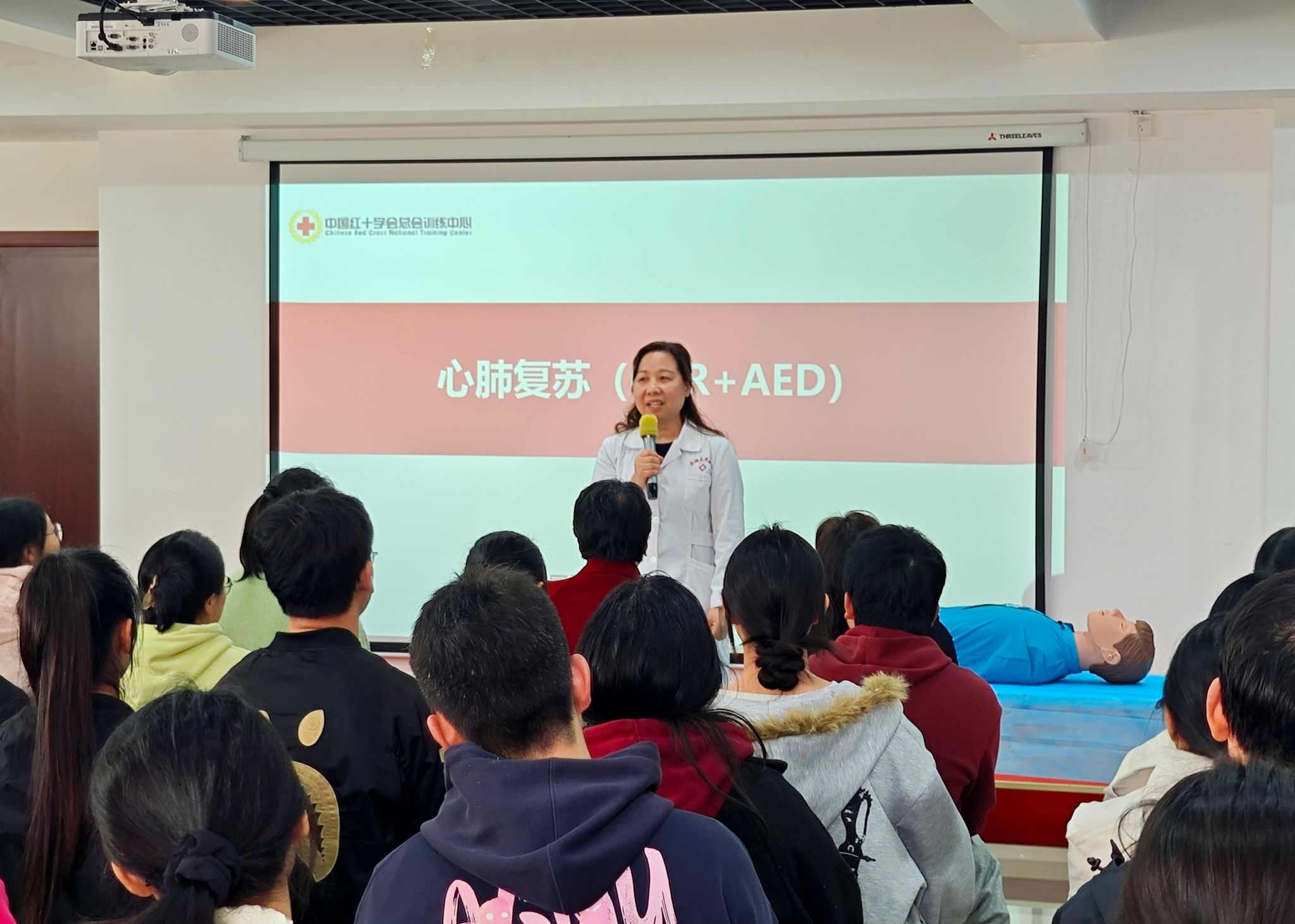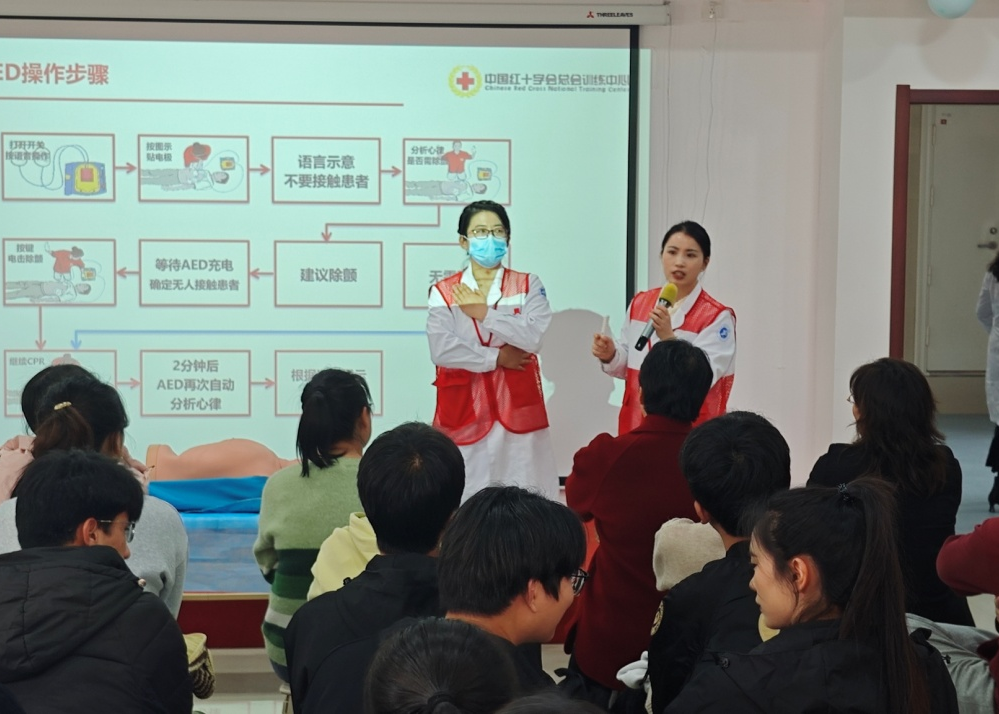 本次培訓(xùn)由校醫(yī)院講師譚亞主講。她系統(tǒng)講解了心肺復(fù)蘇(CPR)操作流程、自動(dòng)體外除顫器(AED)使用方法、氣道異物梗阻急救(海姆立克急救法)等關(guān)鍵內(nèi)容,細(xì)致示范按壓位置、深度、頻率等技術(shù)要點(diǎn),逐項(xiàng)拆解AED操作規(guī)范,并通過情景互動(dòng)強(qiáng)化記憶,幫助參訓(xùn)師生快速掌握核心救命技能,切實(shí)提升應(yīng)急處置意識(shí)與能力。