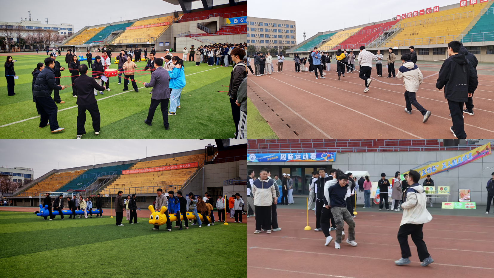 為豐富學(xué)生校園文化生活,踐行協(xié)同育人理念,持續(xù)打造體育特色文化育人品牌,石油工程學(xué)院于3月18日、25日分別在鄠邑校區(qū)東操場(chǎng)舉辦“CRAZY WEDNESDAY”(瘋狂星期三)第一屆冬季趣味運(yùn)動(dòng)表彰儀式和春季趣味運(yùn)動(dòng)開(kāi)幕比賽。